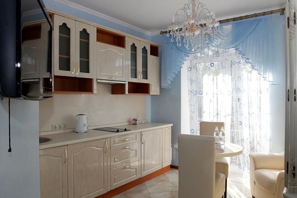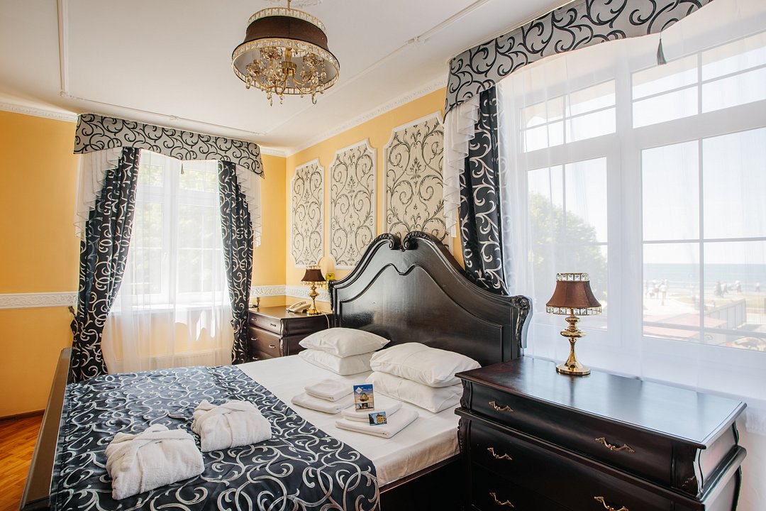 Апартаменты с видом на море, площадь от 40 кв.м. с одной большой двуспальной кроватью. Удобства номера: Гостиная-столовая с кухней: холодильник, плита, стол, стулья, диван, телевизор, посуда, чайный набор. Балкон вид на море\город. Спальная комната: большая двуспальная кровать, комод/зеркало, шкаф, телевизор, кондиционер, отопление, телефон, сейф, гладильные принадлежности. Ванная комната: ванная, туалет, биде, раковина, фен, бесплатные туалетно-косметические принадлежности, халат, тапочки. В номере возможно размещение дополнительных мест для взрослых и детей.