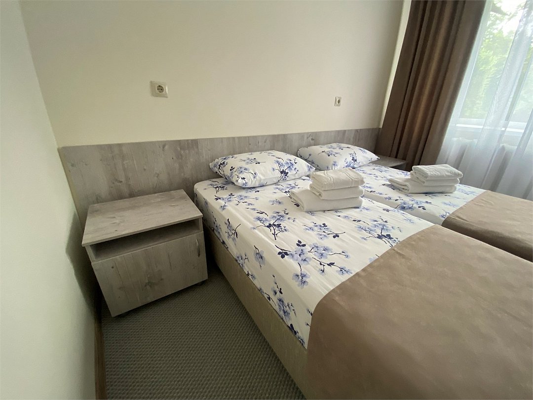 Номер с двумя кроватями размером 90*200 ( или двумя кроватями спринг-бокс размером 80х200) и всеми удобствами.