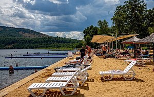 Тип пляжа: галечный, собственный, оборудованныйИнфраструктура: лежаки, зонтики, шезлонги, барСобственный пляж протяженностью около 200 метров. Берег – мелкая и средняя галька, летнее кафе на пляже, площадка для пляжного волейбола, шезлонги, кафе «Таверна».