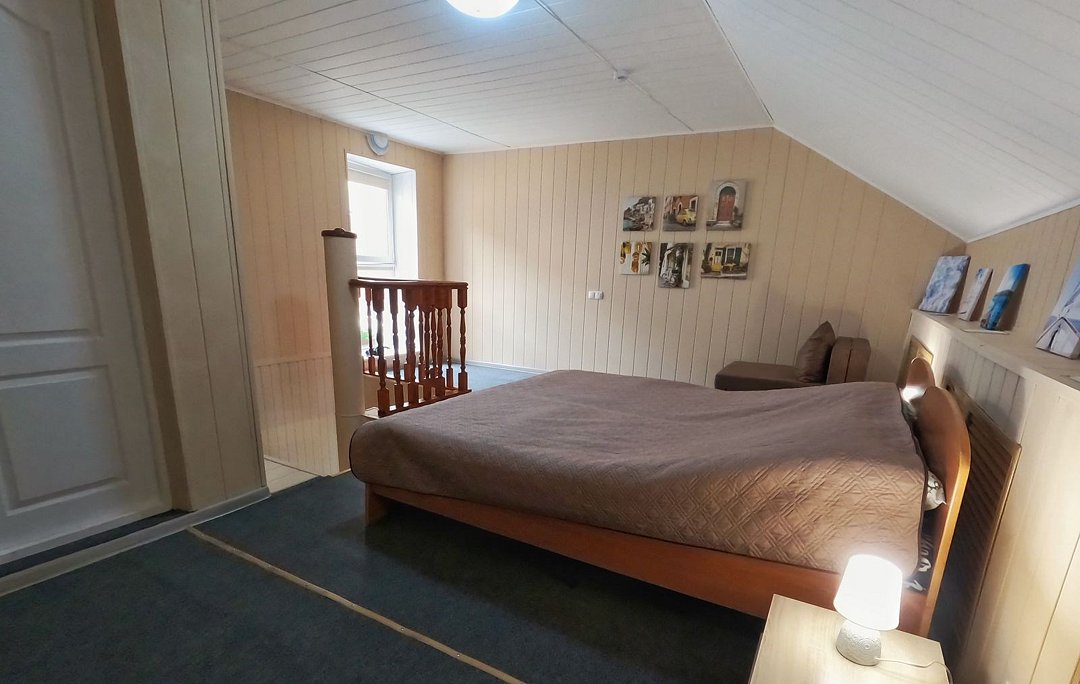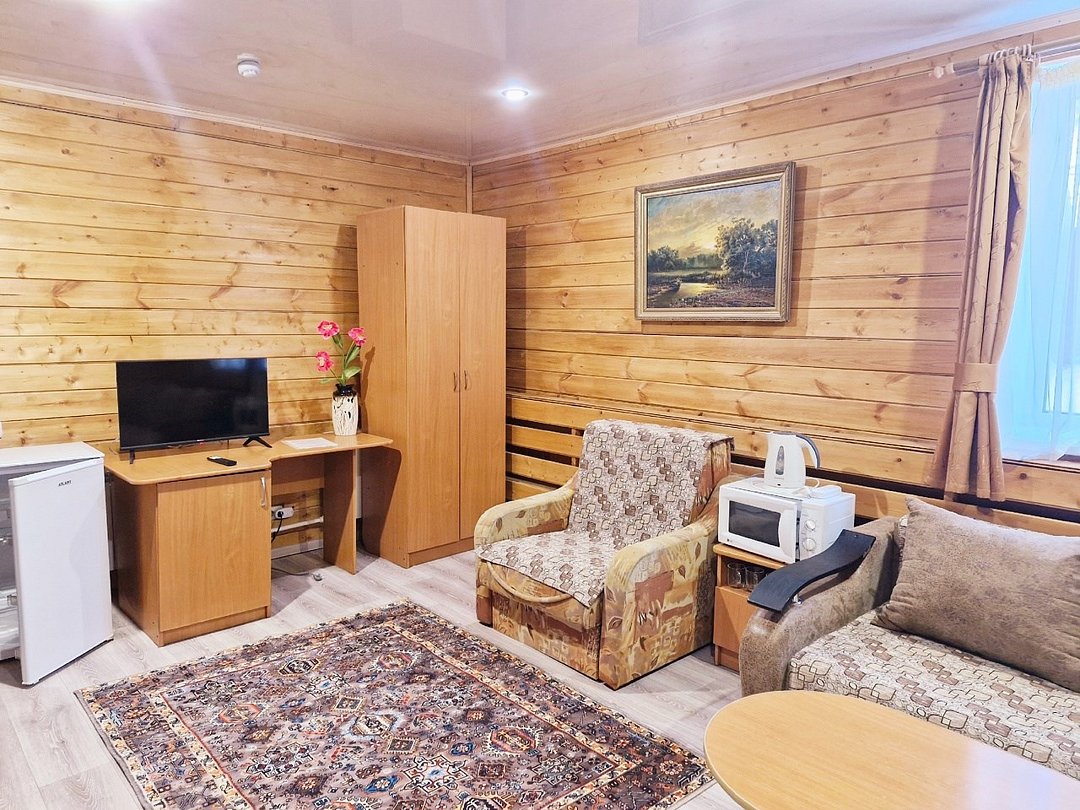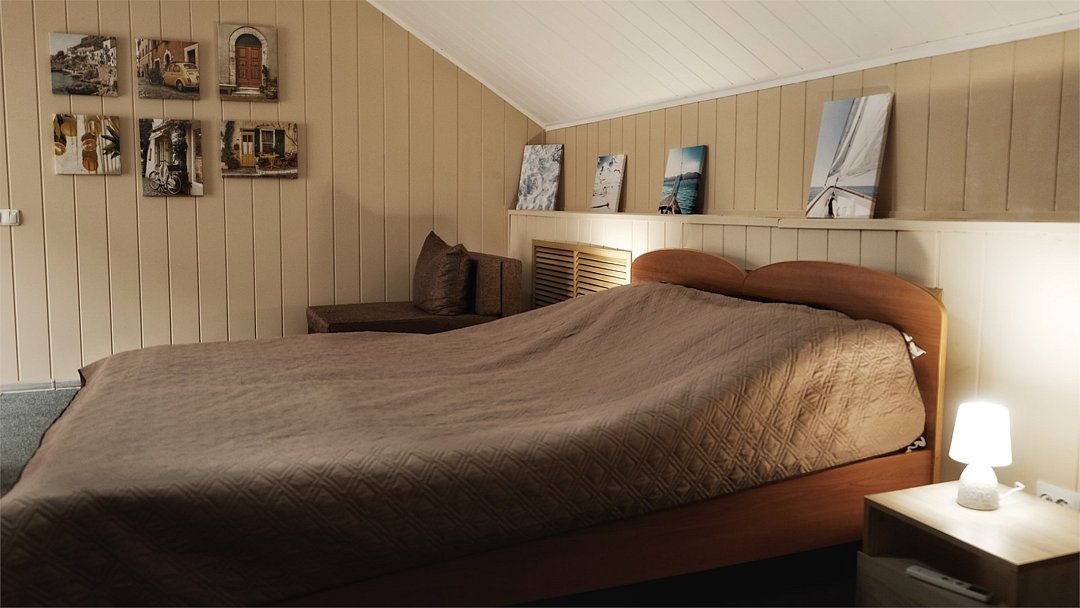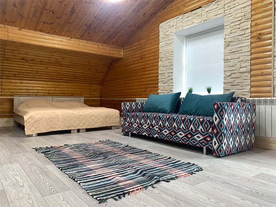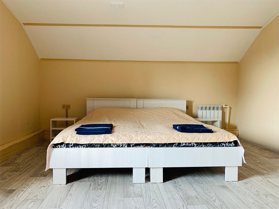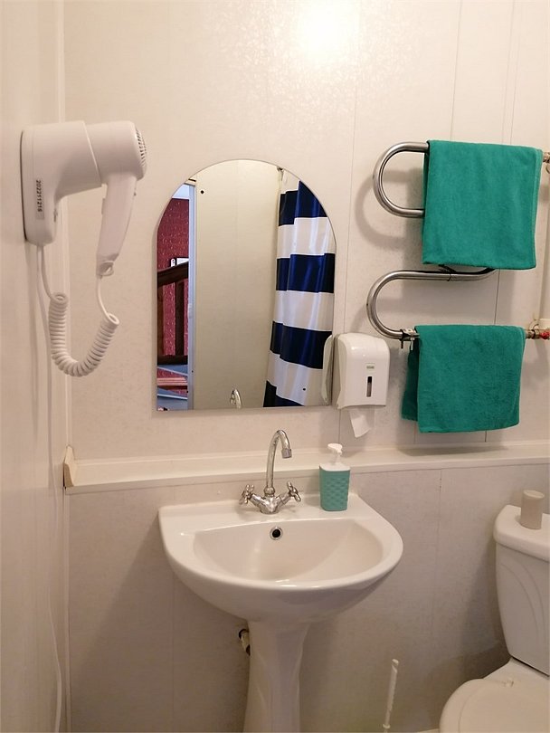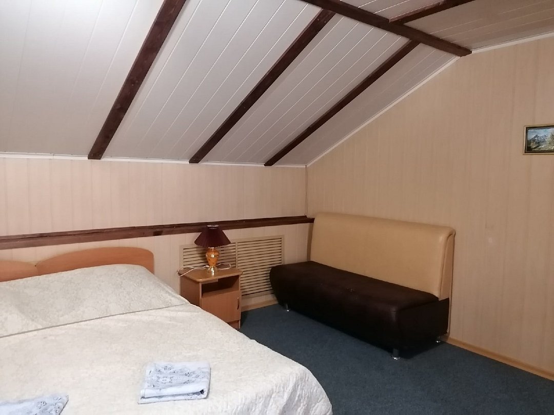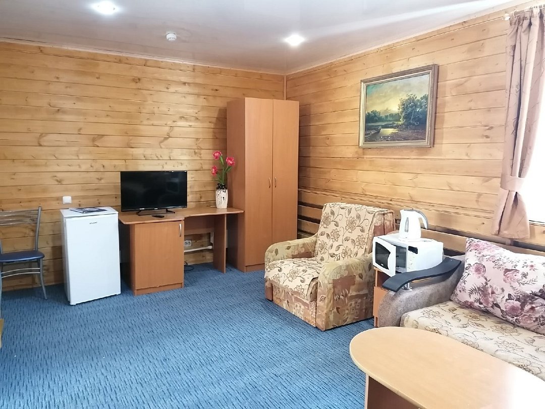 2-этажные номера 60 кв.м с размещением до 4 человек. (Возможны 2 дополнительных места по 500 руб. в сутки на человека, дети до 5 лет - бесплатно). Стены обшиты деревом \фальш-брус\. В номере - душ, 2 санузла, фен, Wi-Fi, холодильник, чайник, чашки, телевизор, микроволновая печь, обеденный стол и журнальный. По запросу - мультиварка или индукционная плита с посудой. Номера постоянно обновляются - установили новые двери и 2-хстворчатые окна с москитной сеткой, фены, в №7 и №8 купили ковры на белый линолеум, во все номера - накидки на диваны и кресла. На 2-й этаж ведет винтовая лестница. В двух номерах есть детские кроватки. Есть номера с кондиционерами. Спальные места – на 2 этаже 2 односпальные кровати, на 1 этаже диван раскладной и раскладное кресло Посуду и нож, а также угли и шампуры для мангала, рекомендуем взять с собой.Услуги и удобства