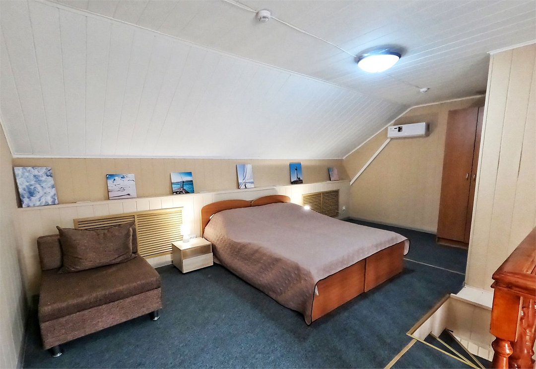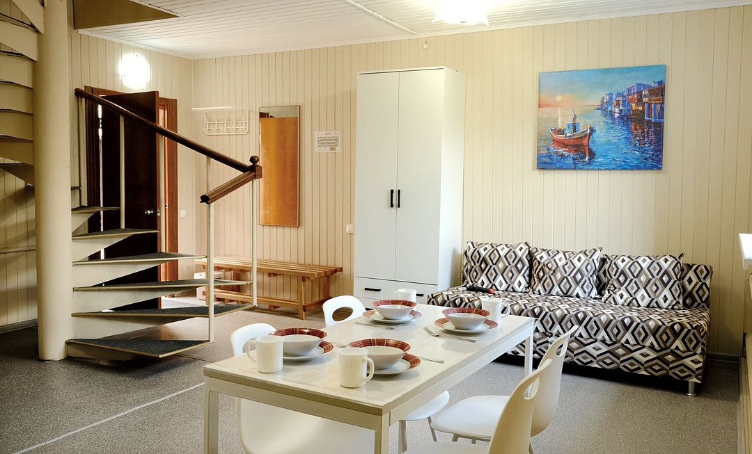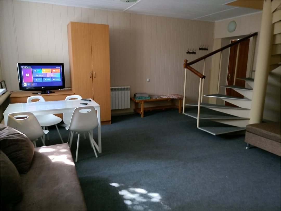 Двухэтажный номер с размещением до 6-х человек (4 осн. места+ 2 дополнительных). Свежий ремонт 2024г!!! В номере - кухонная зона (холодильник, мойка, электрочайник, микроволновая печь, посуда), 2 санузла (душевые на каждом этаже, гигиенический душ), ТВ, Wi-Fi. На 2-й этаж ведет винтовая лестница. На 1 этаже: раскладной диван, кресло-кровать, шкаф плательный, кухонная и обеденные зоны. На 2 этаже: 2 односпальные кровати, шкаф плательный.Услуги и удобства