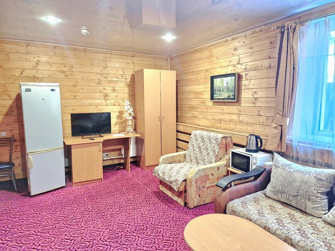 Двухкомнатное Бунгало 35 кв.м. с кухонной зоной, с размещением до 2 человек. Находится сзади гостиницы, отдельный вход. В Бунгало - раскладной диван, 2успальная кровать, ТВ, ванна, санузел, посуда, эл.плита, эл.чайник, холодильник, микроволновка. Уникальный вид на ГЛЦ! С детьми и животными не селим.Услуги и удобства