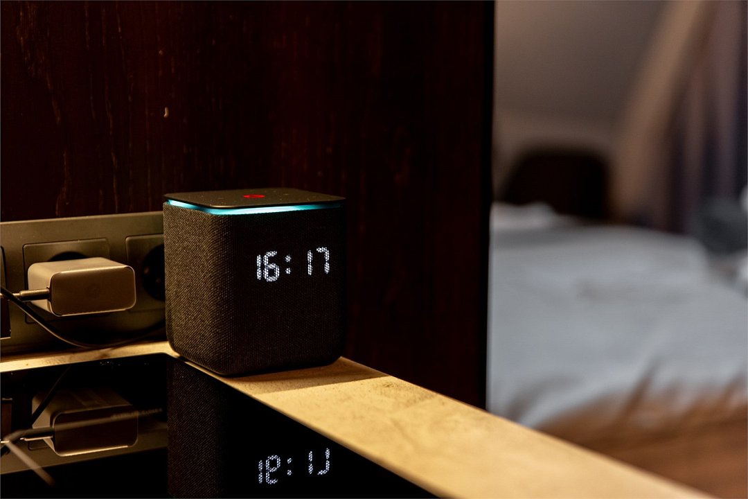 Питьевая вода, кофе, листовой чай и сахар. Алиса управляет светом, шторами и другими функциями.