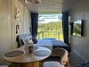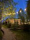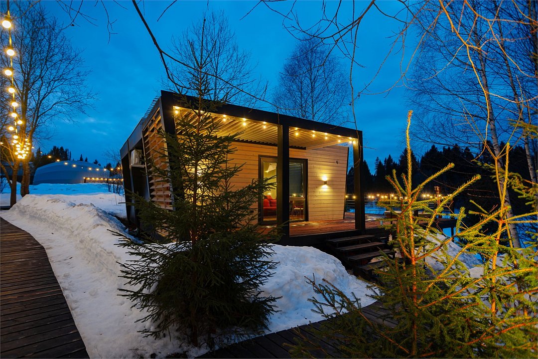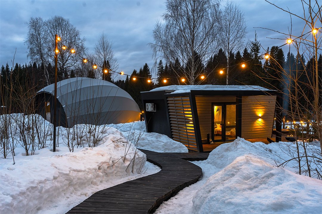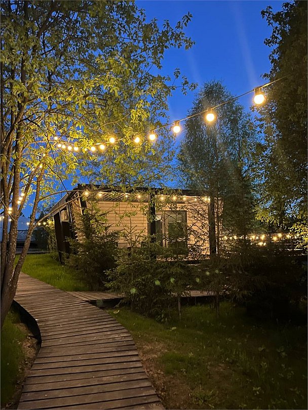 Из окон дома открывается прекрасный вид на лес и маленькую речку, а также вы всегда можете прогуляться по территории глэмпинга по благоустроенным дорожкам, которые особенно красивы в вечернее время, когда включена декоративная подсветка.