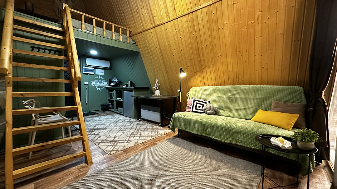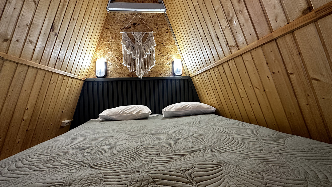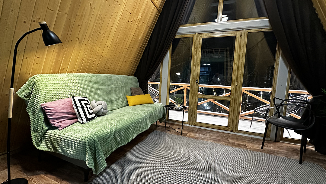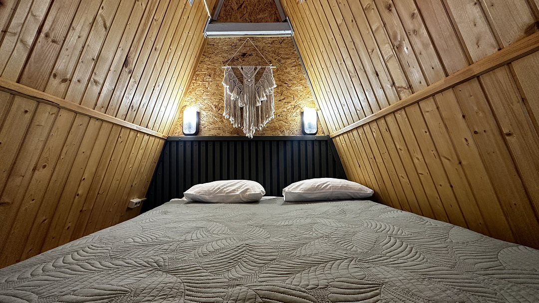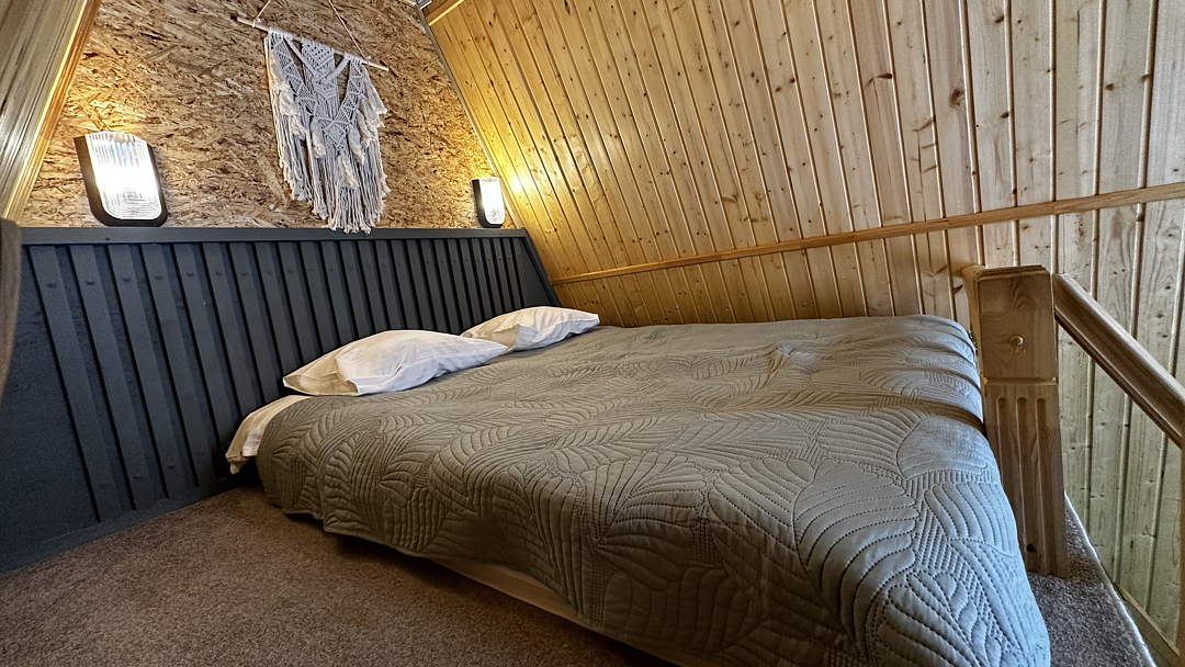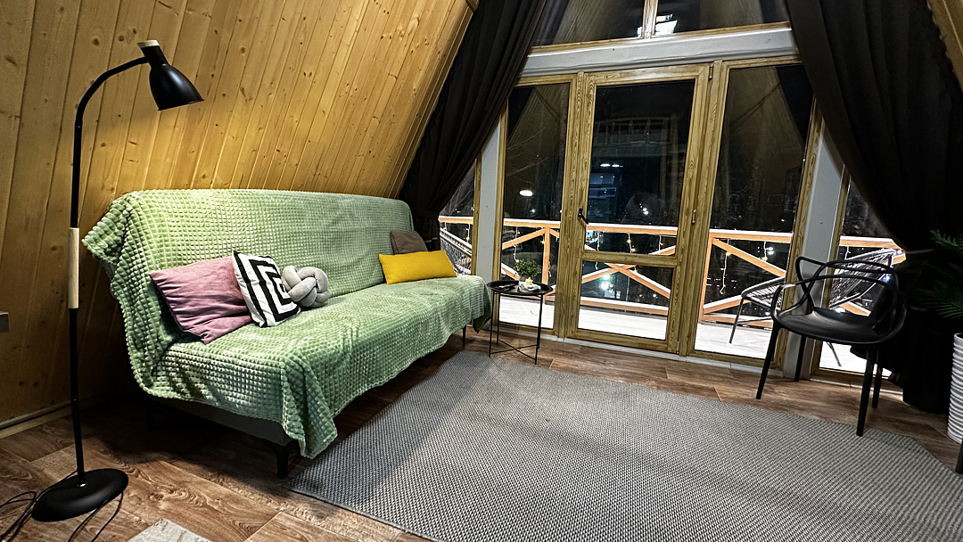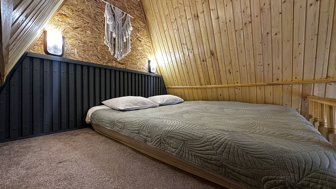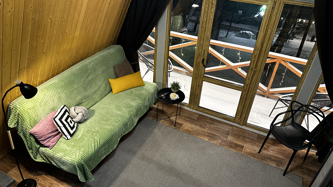 Дом оборудован двумя спальными местами: кроватью на втором этаже (200×160 см) и диваном на первом этаже (190×135 см).