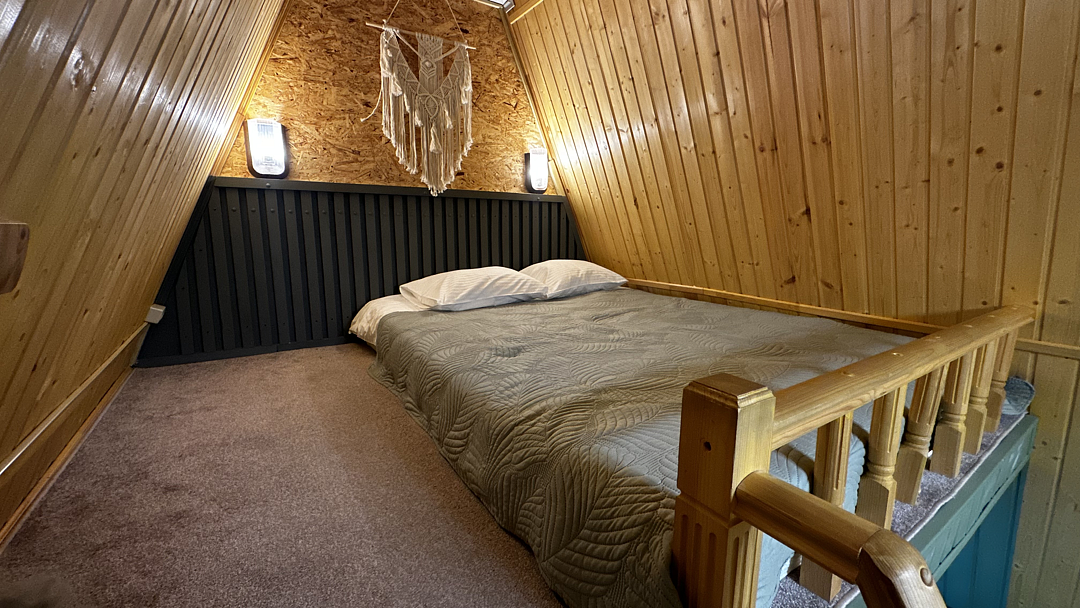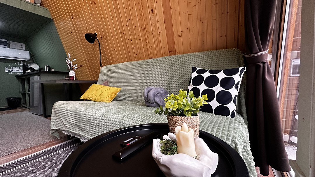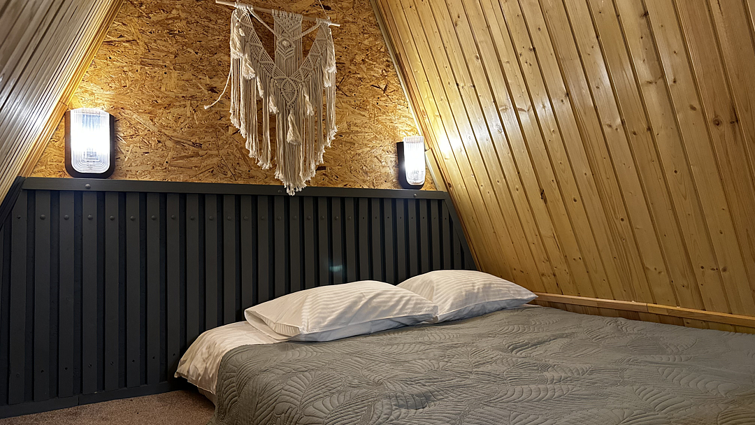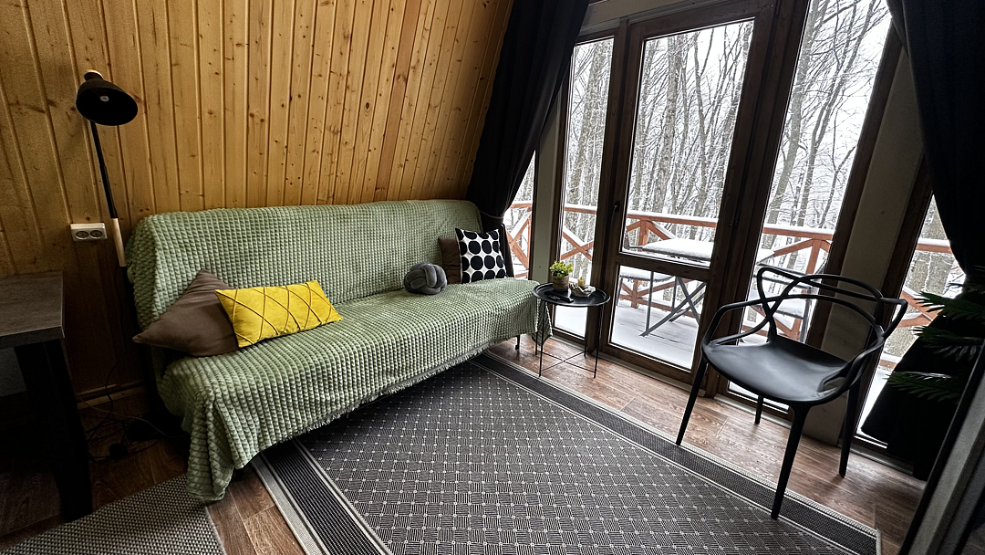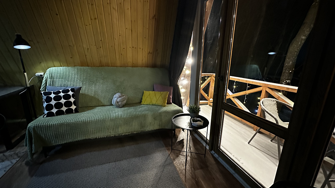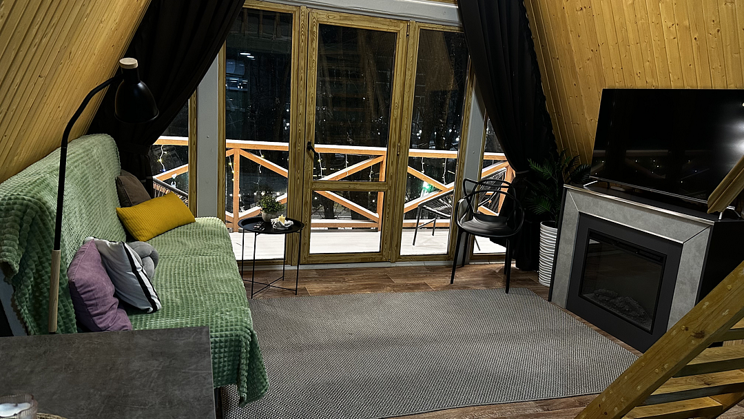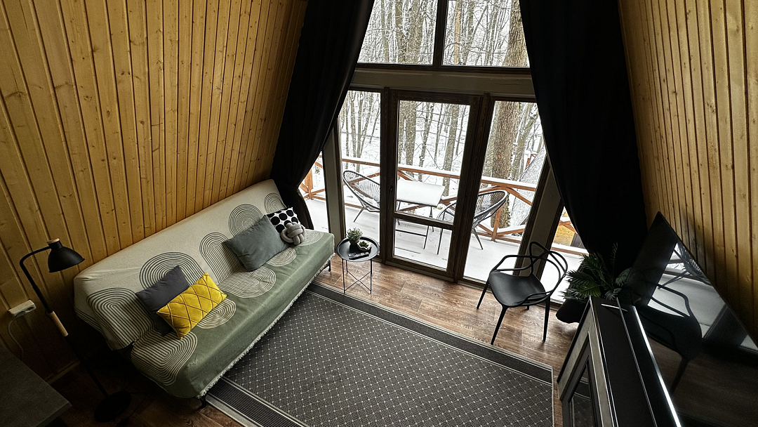 Дом оборудован двумя спальными местами: кроватью на втором этаже (200×160 см) и диваном на первом этаже (190×135 см).