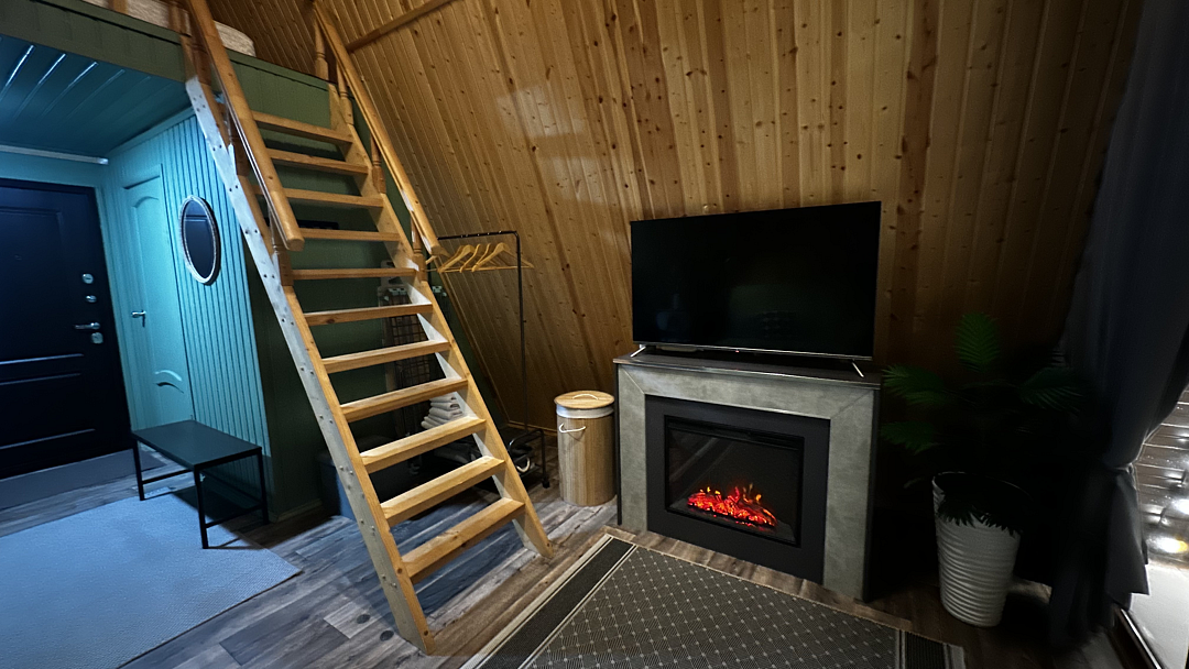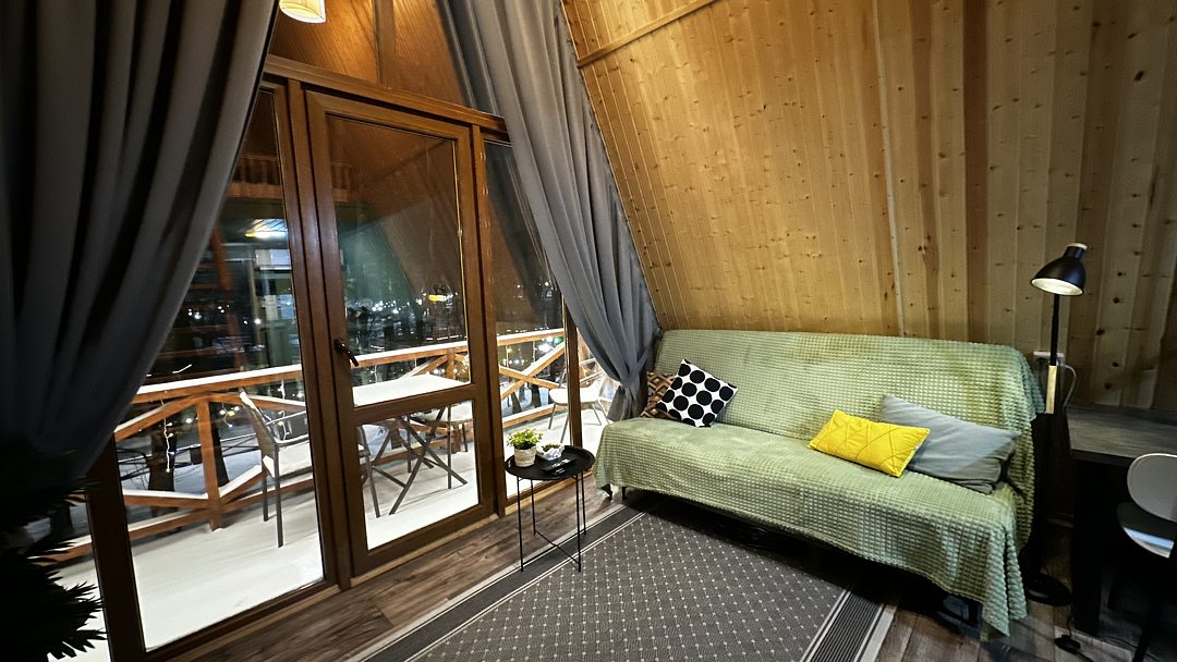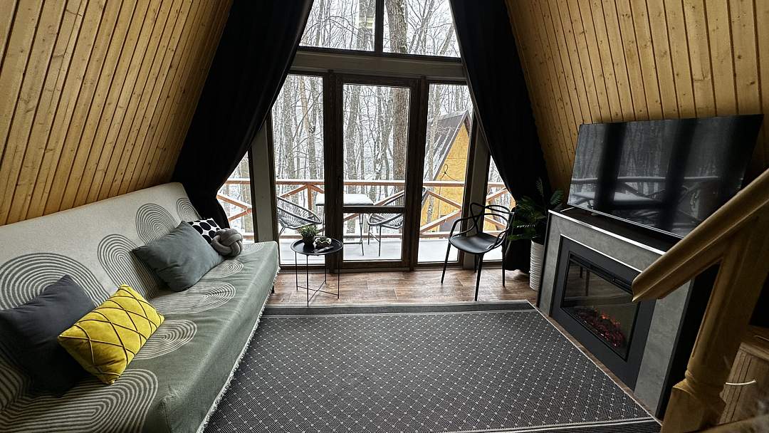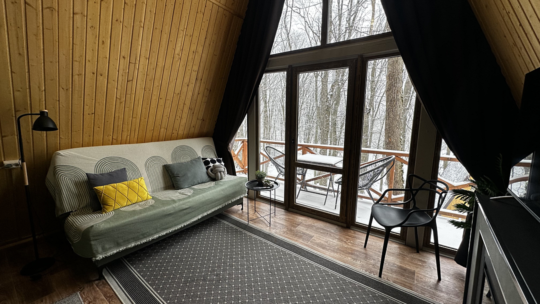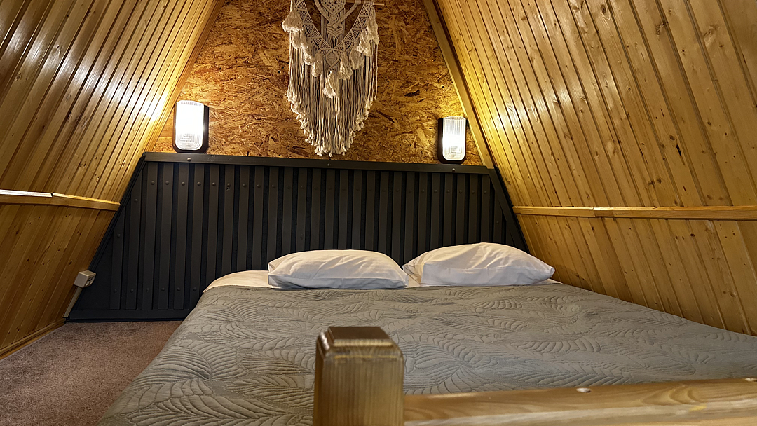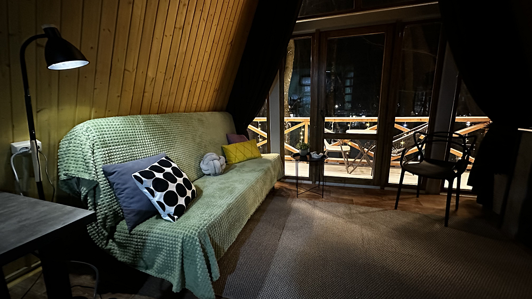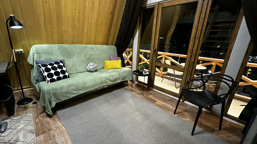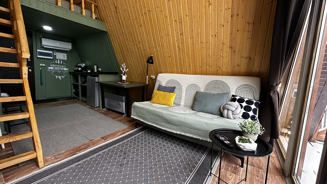 Дом оборудован двумя спальными местами: кроватью на втором этаже (200×160 см) и диваном на первом этаже (190×135 см).