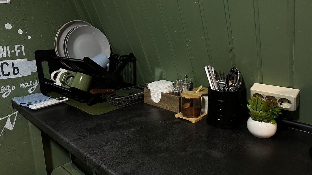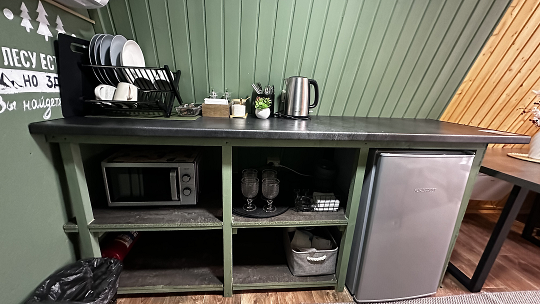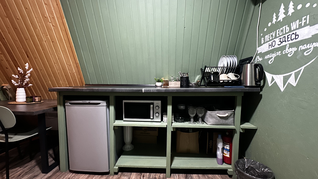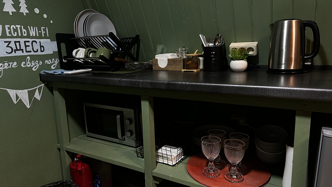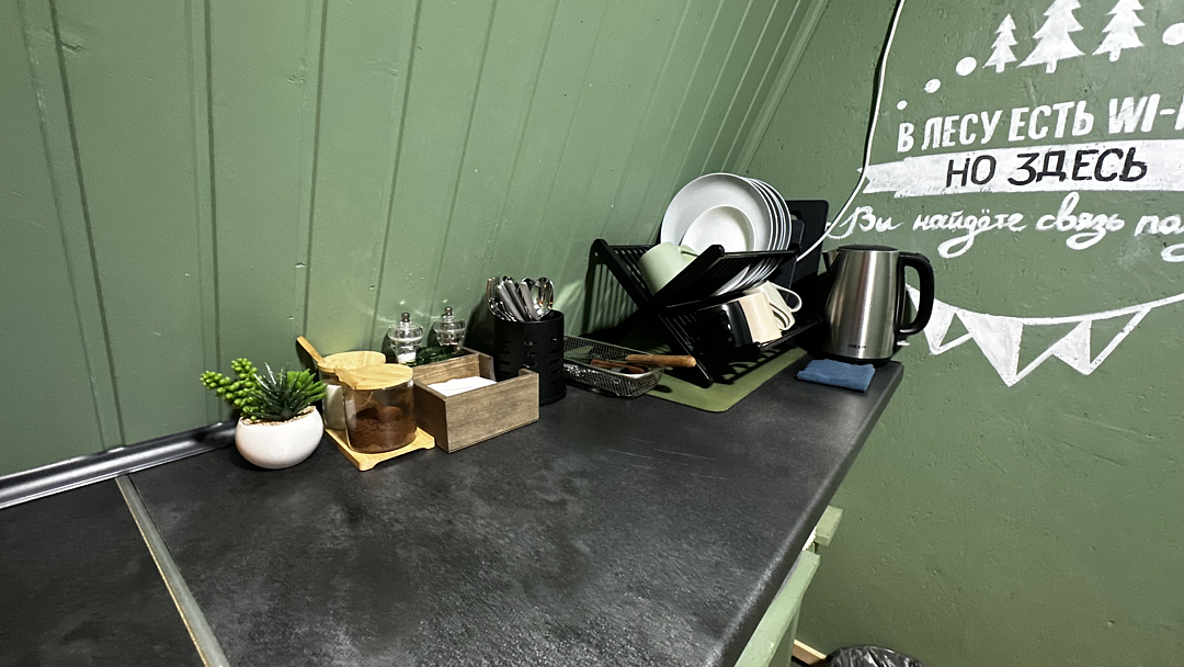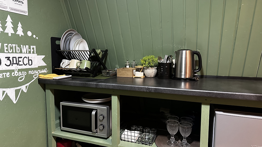 Кухня оснащена чайником, холодильником, микроволновой печью и посудой. Также предоставляются моющие средства. Варочная панель и мангальная зона запрещены, но гостям предоставляется скидка 10% на меню в кафе «30|КА», которое находится у подножия дома.