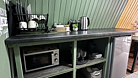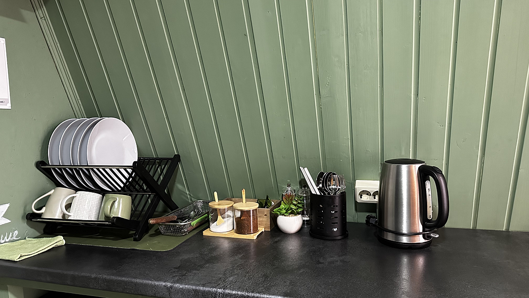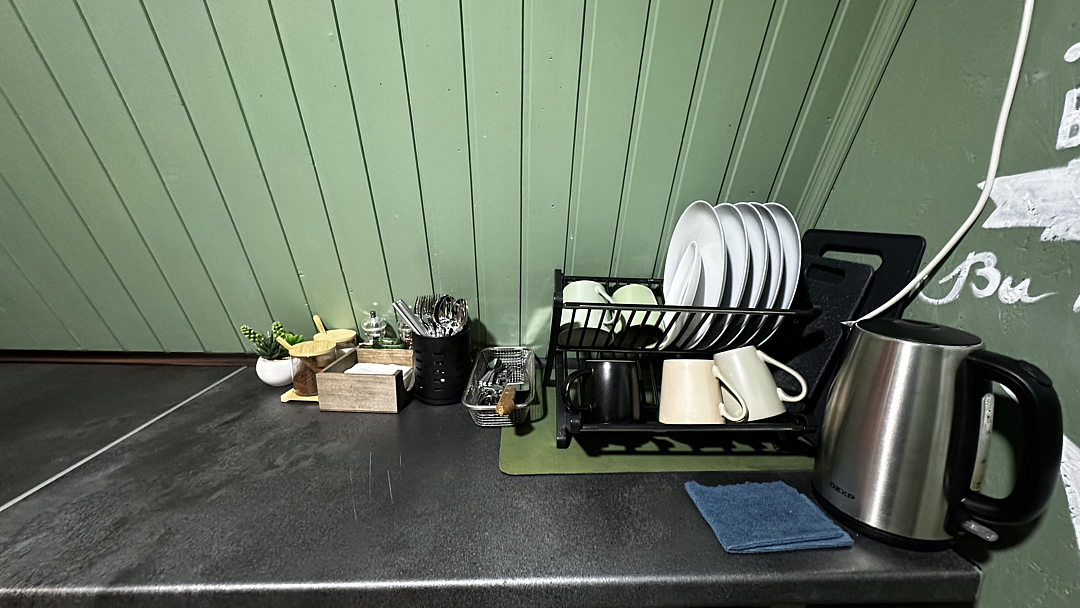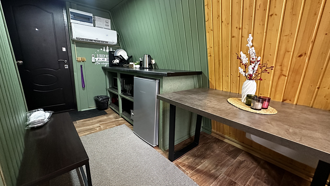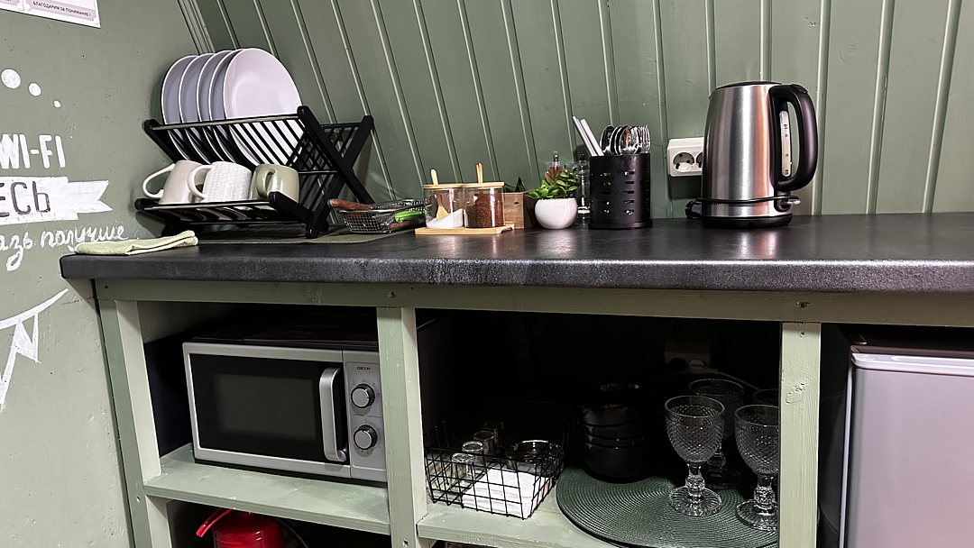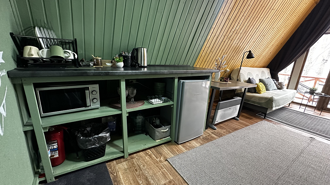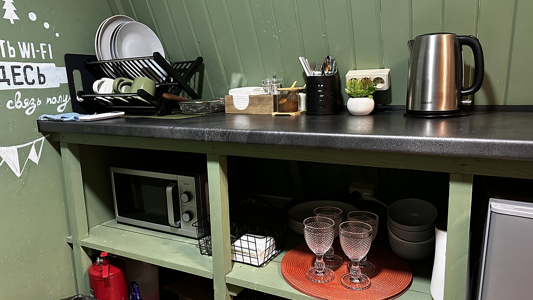 Кухня оснащена чайником, холодильником, микроволновой печью и посудой. Также предоставляются моющие средства. Варочная панель и мангальная зона запрещены, но гостям предоставляется скидка 10% на меню в кафе «30|КА», которое находится у подножия дома.