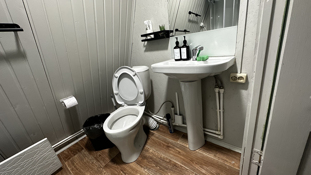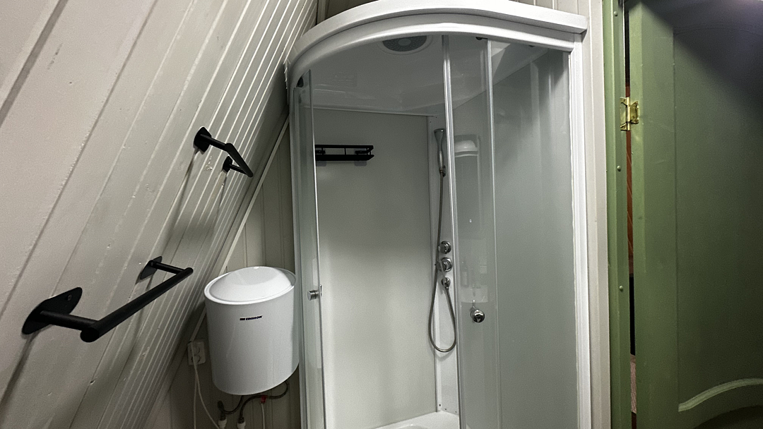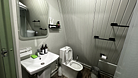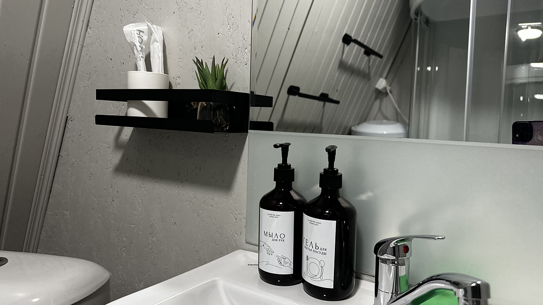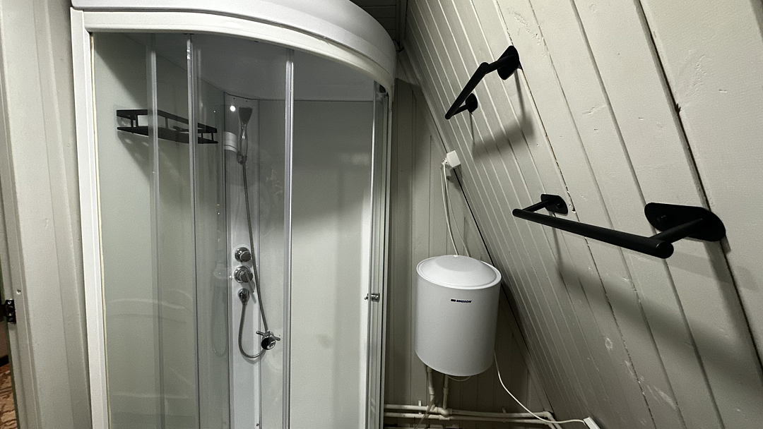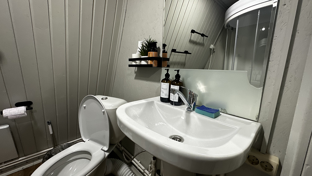 Санузел оборудован душевой кабиной, туалетом, раковиной, набором для гигиены, полотенцами и тапочками.