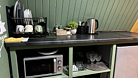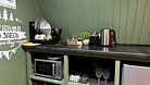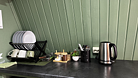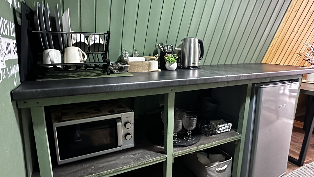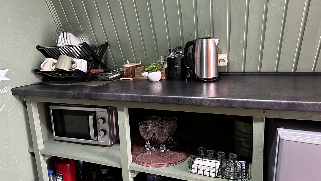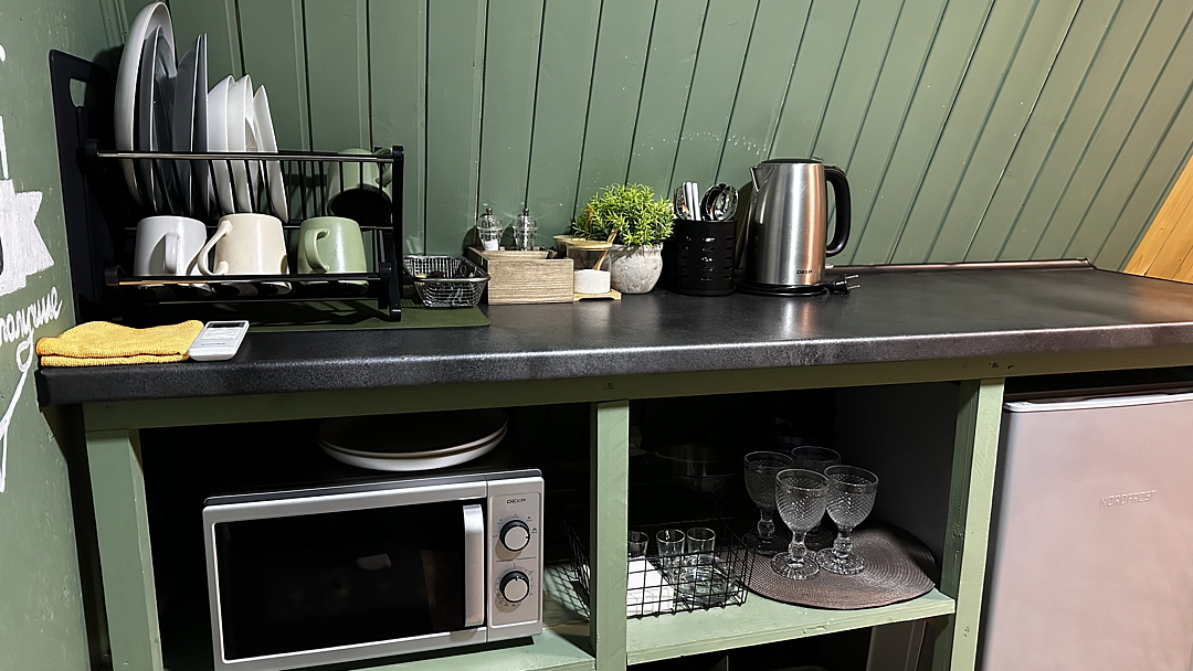 В доме расположен кухонный уголок с чайником, холодильником, микроволновой печью, столовыми приборами, посудой, большим столом. Также предоставляются моющие средства для вашего удобства.