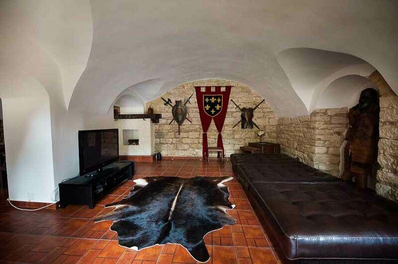 В доме расположены семейная спальня (двуспальная кровать, комод, встроенный шкаф, прикроватные тумбочки), детская комната (диван, комод, встроенный шкаф), гостиная (большой круглый диван со спальными местами, три встроенных шкафа, телевизор (спутниковое TV)), старинный зал (большой диван, телевизор (спутниковое TV), музыкальный центр + караоке), кухня-столовая.