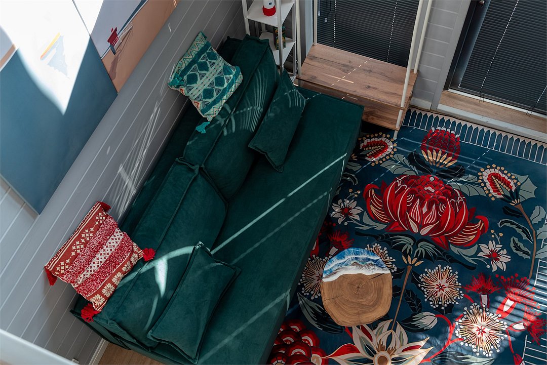На первом этаже — гостиная с кухней и выходом на террасу, на втором — уютная спальня с видом на холмы.