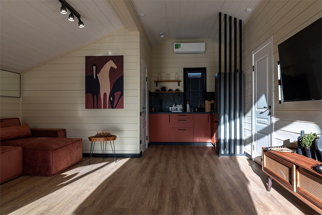 2 взрослых на основных местахБез питанияБарнХаус "Жокей"ПодробнееСтильный одноэтажный дом для 4–6 гостей с просторной планировкой и светлой гостиной.