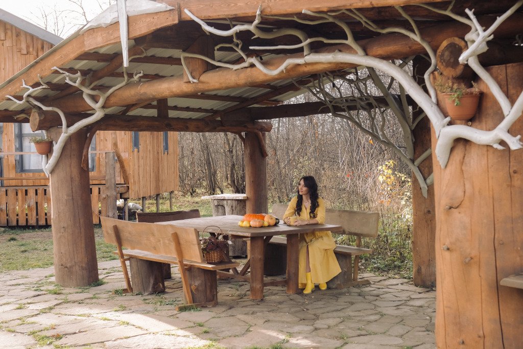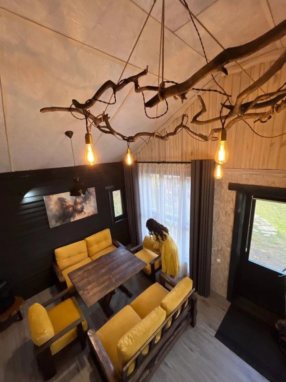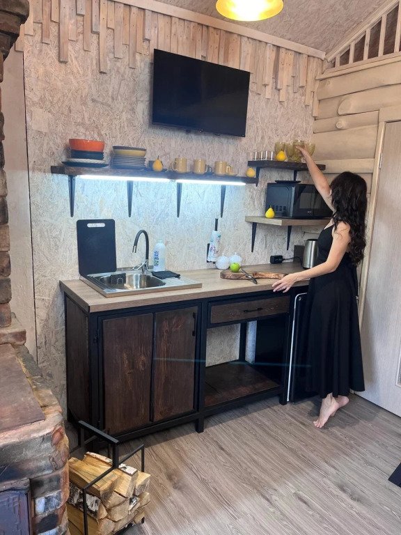 Для путешественников на машине организована парковка. Дом с уникальным интерьером из натурального дерева и дизайнерской деревянной мебелью ручной работы создают уют и особое настроение. Дом вмещает шесть человек, имеет три спальни, санузел с душевой, а также кухню. В распоряжении гостей собственный двор с беседкой и мангальной зоной.
