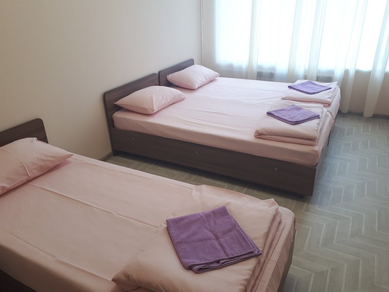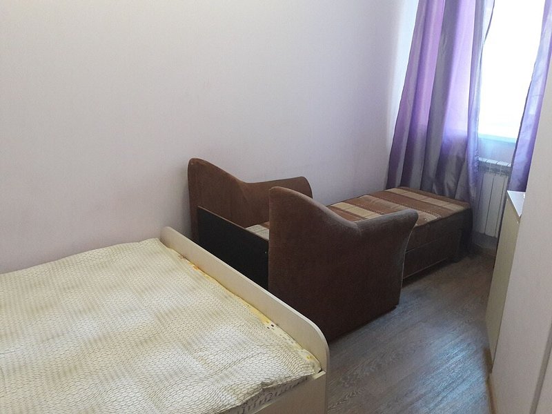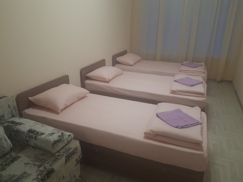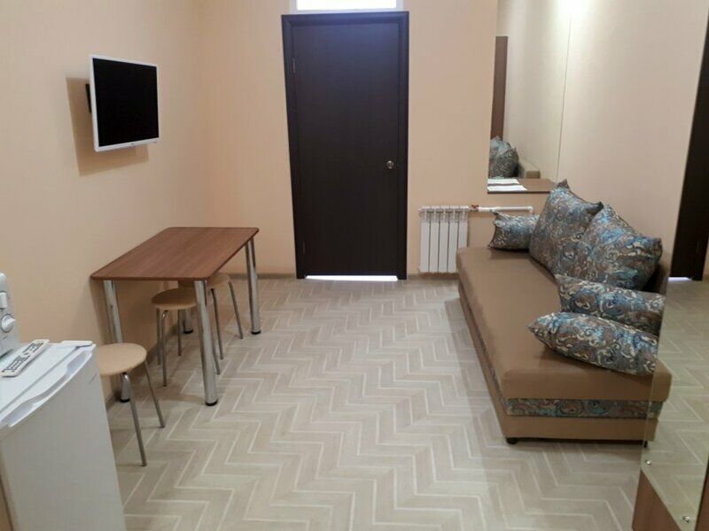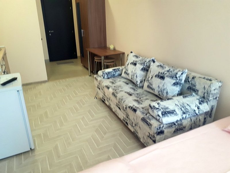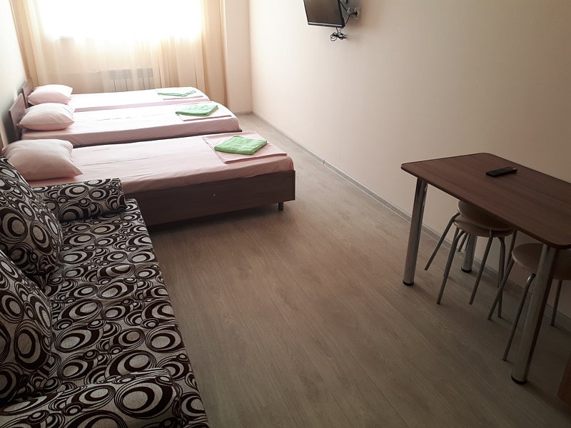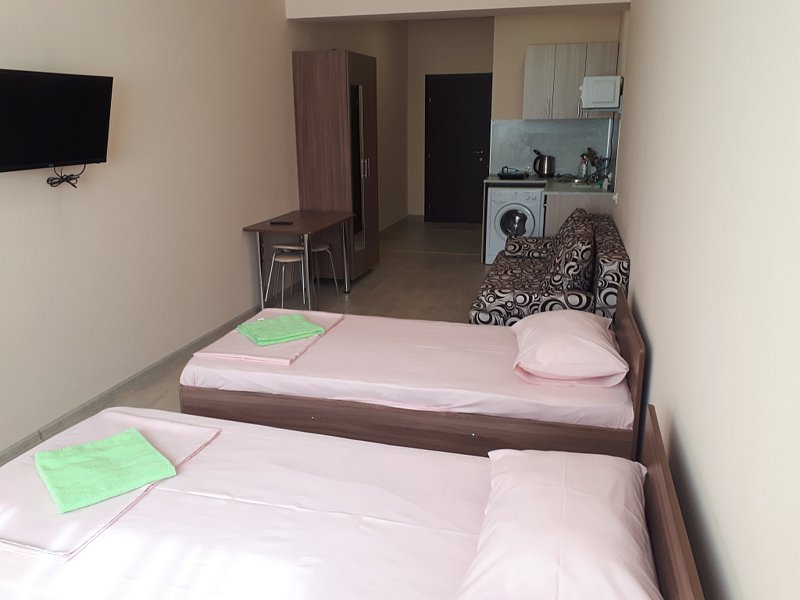 Чистая уютная студия, чистое постельное бельё, полотенца. В номере есть вся бытовая техника, посуда, телевизор, кабельное ТВ, Wi-Fi, стиральная машина автомат, СВЧ печь, чайник, плитка, холодильник и все необходимое для комфортного проживания. Спальные места: раскладной диван, двуспальная и односпальные кровати.
