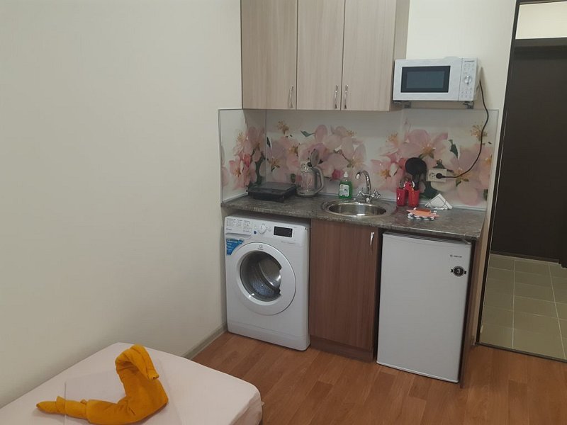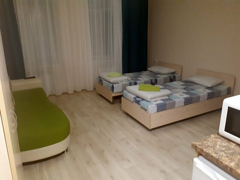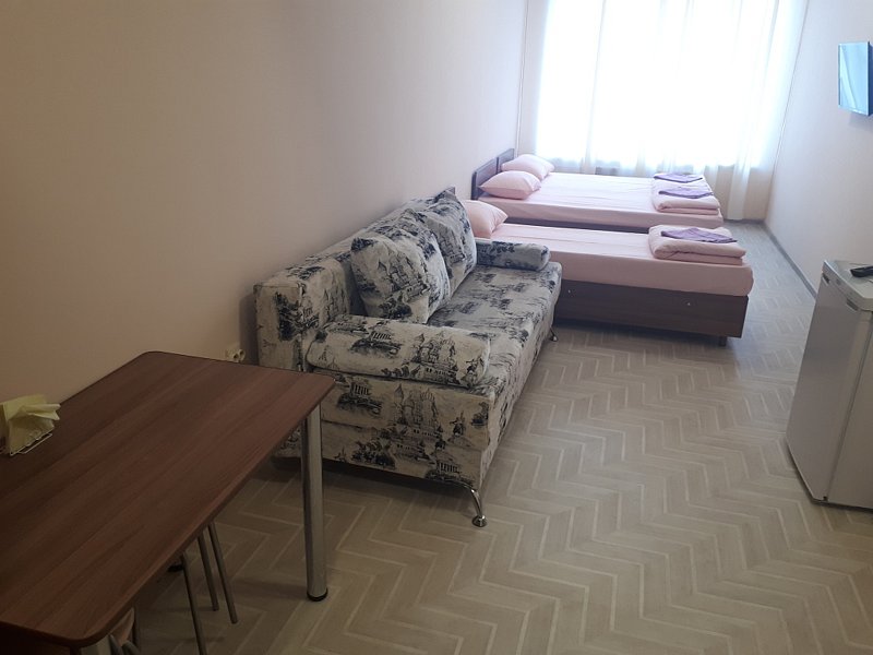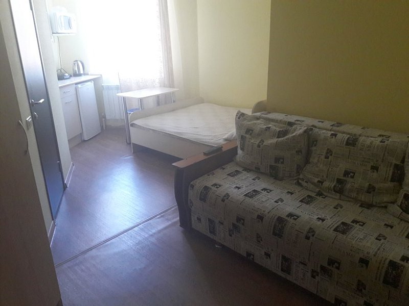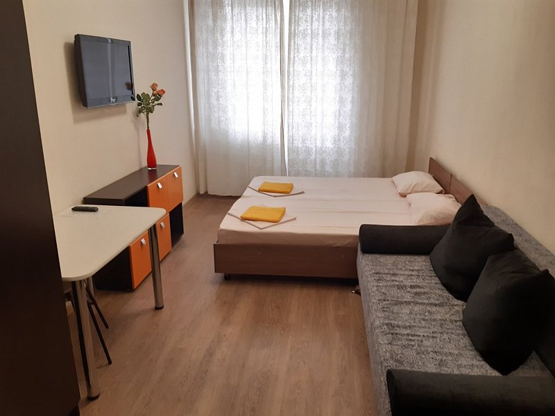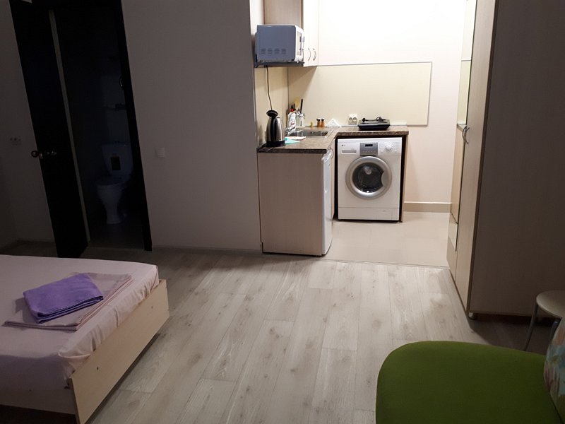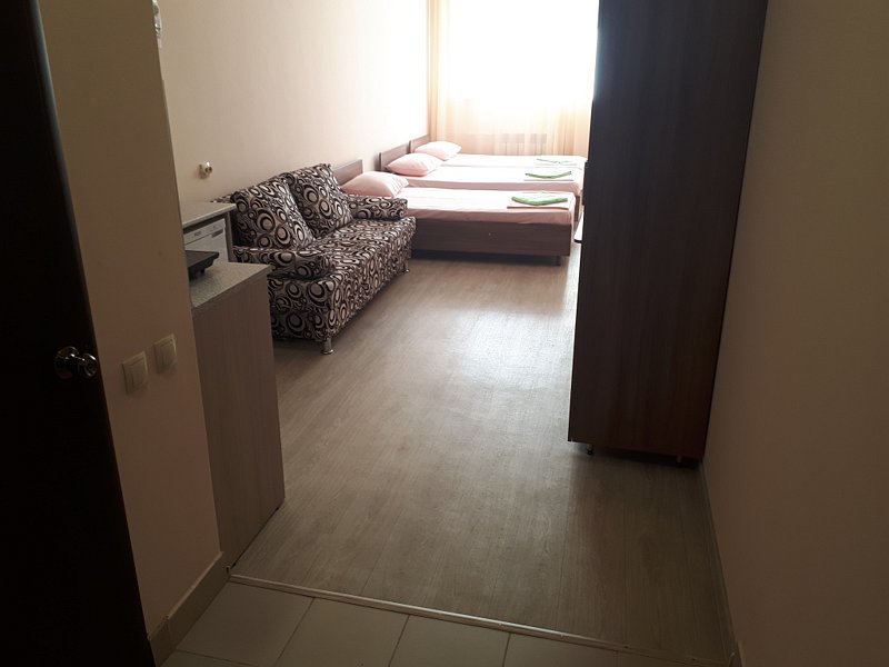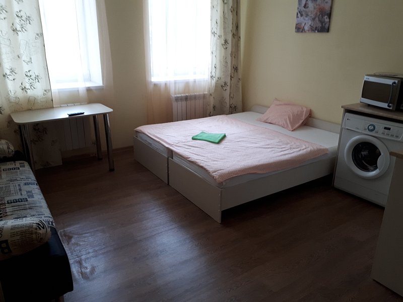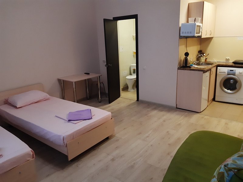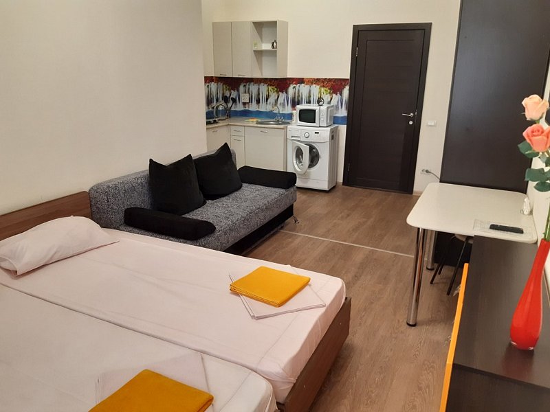 Чистая уютная студия, чистое постельное бельё, полотенца. В номере есть вся бытовая техника, посуда, телевизор, кабельное ТВ, Wi-Fi, стиральная машина автомат, СВЧ печь, чайник, плитка, холодильник и все необходимое для комфортного проживания. Спальные места: раскладной диван, односпальные кровати.