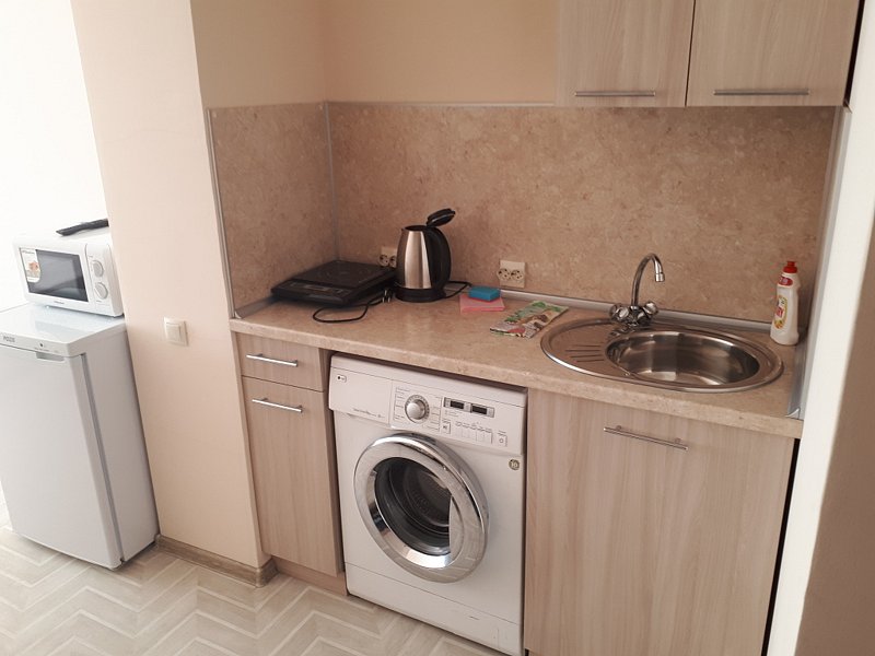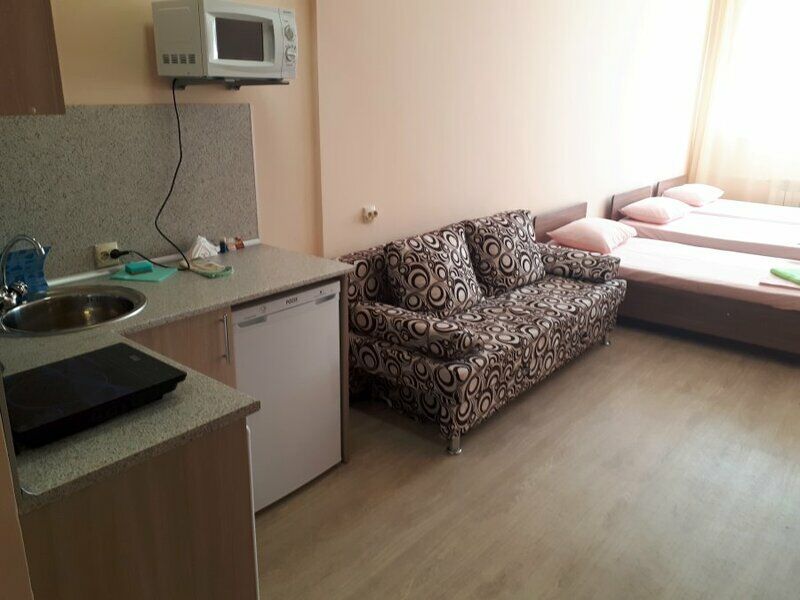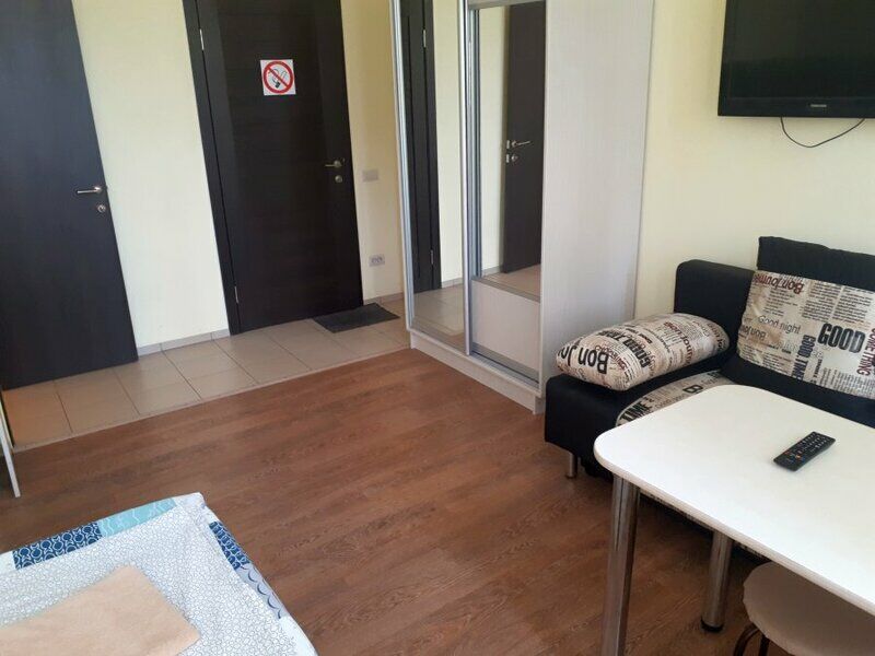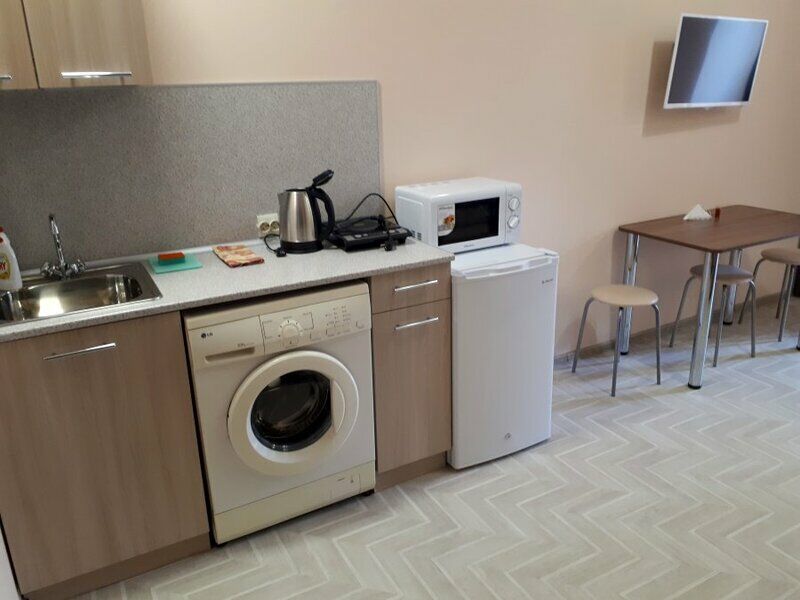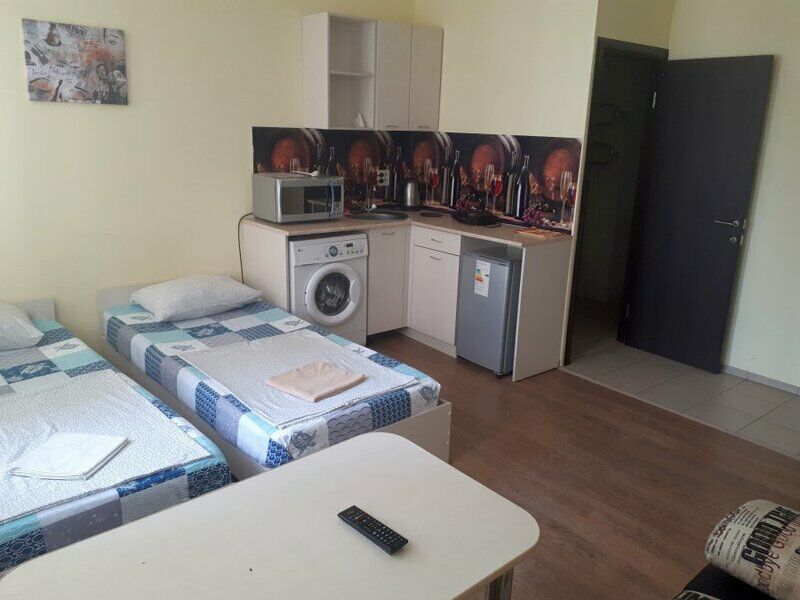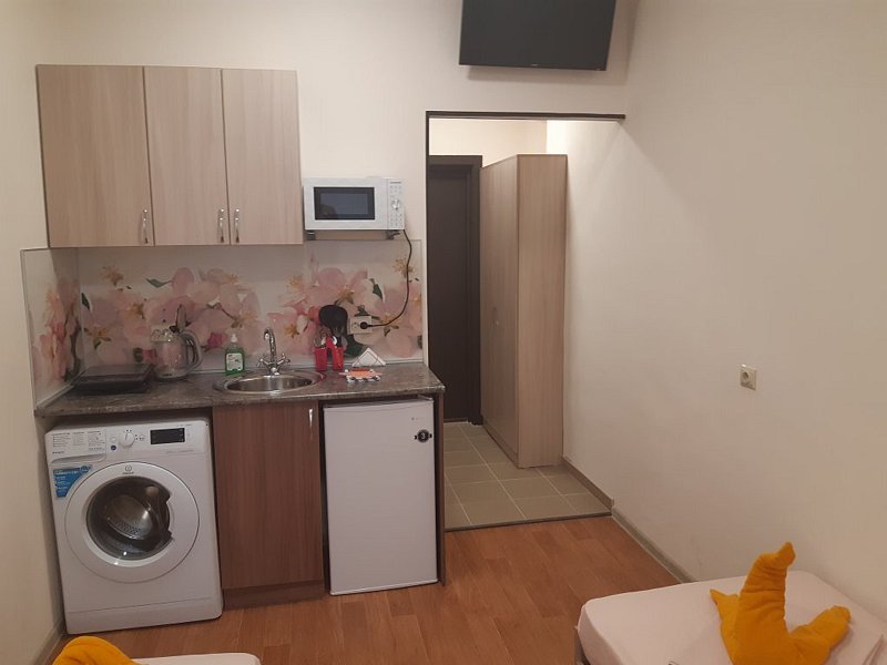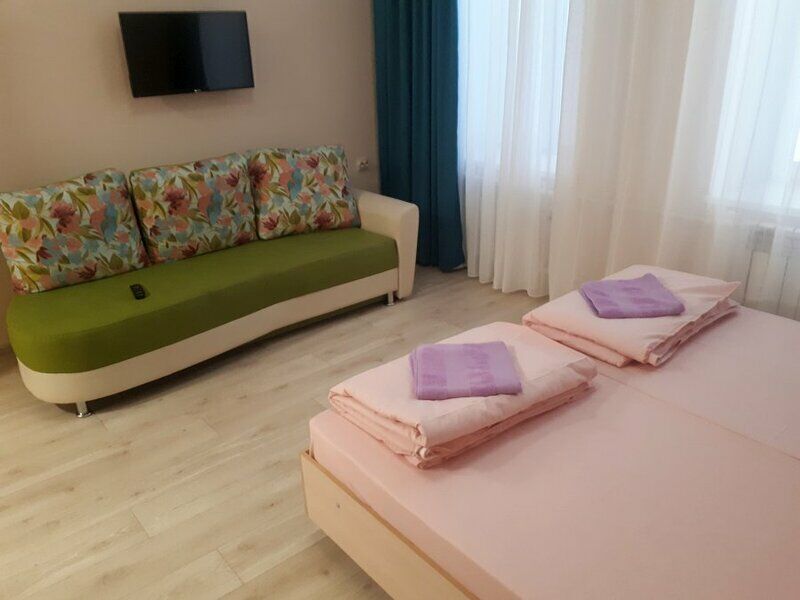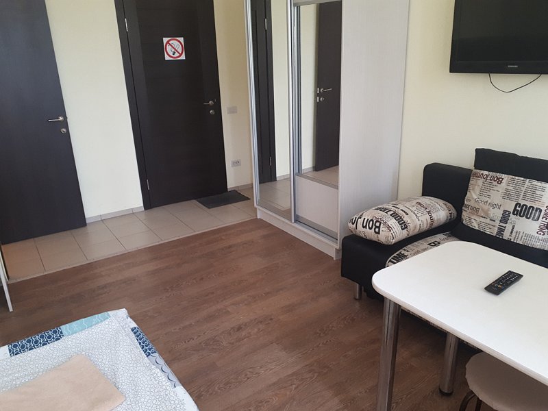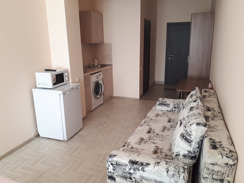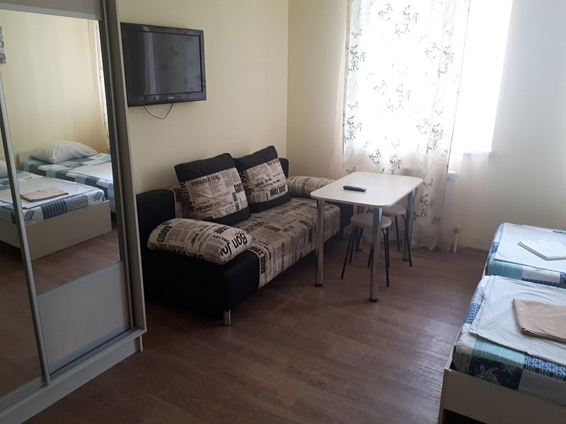 Чистая уютная студия, чистое постельное бельё, полотенца. В номере есть вся бытовая техника, посуда, телевизор, кабельное ТВ, Wi-Fi, стиральная машина автомат, СВЧ печь, чайник, плитка, холодильник и все необходимое для комфортного проживания. Спальные места: раскладной диван, односпальные кровати.