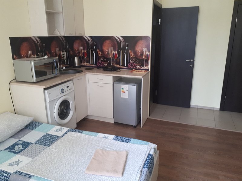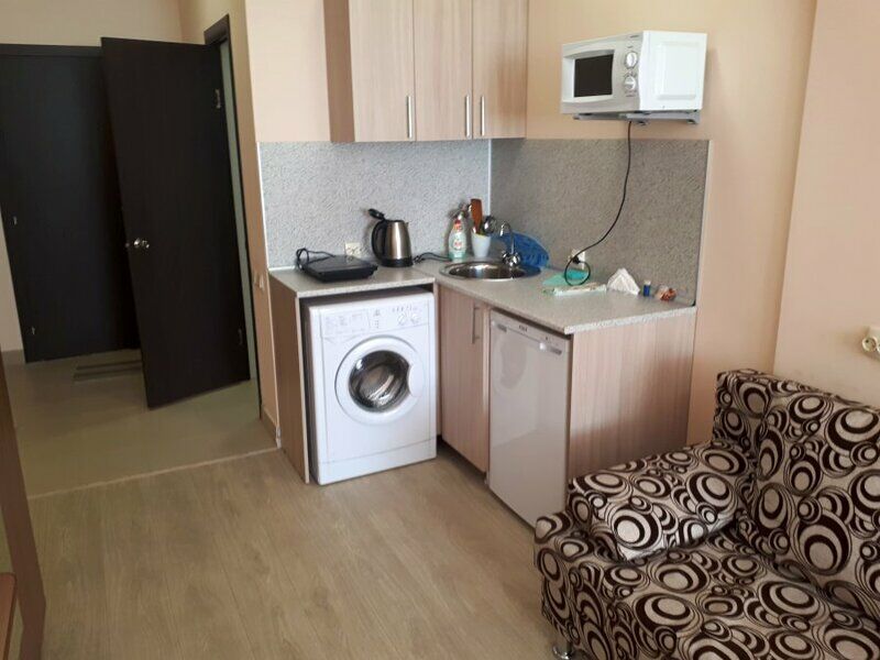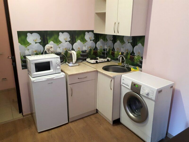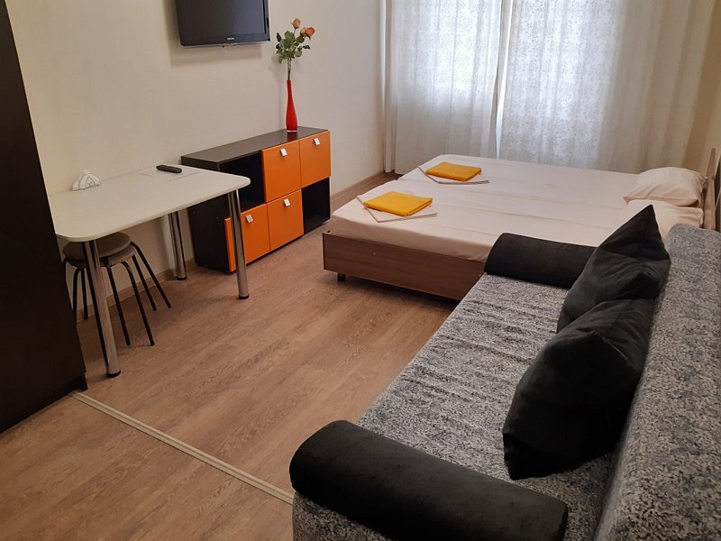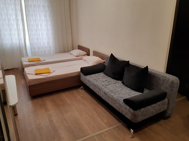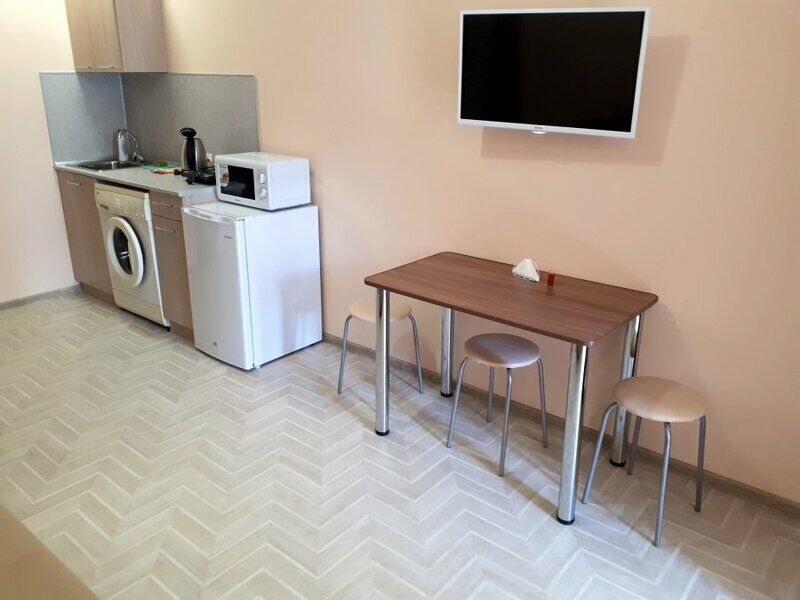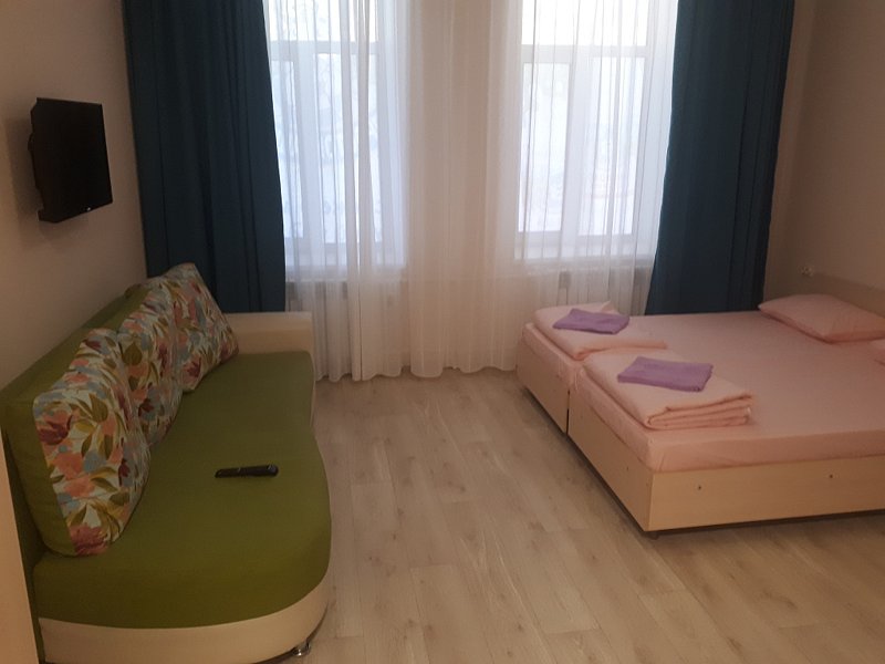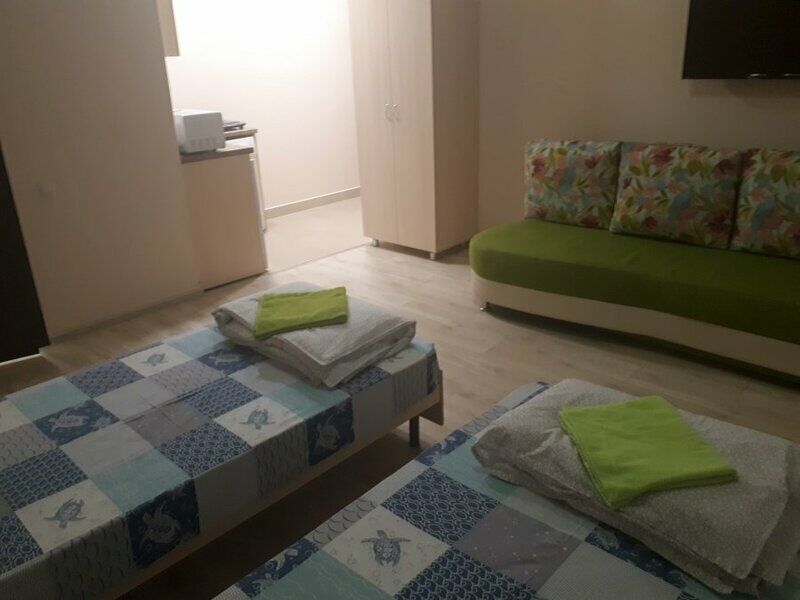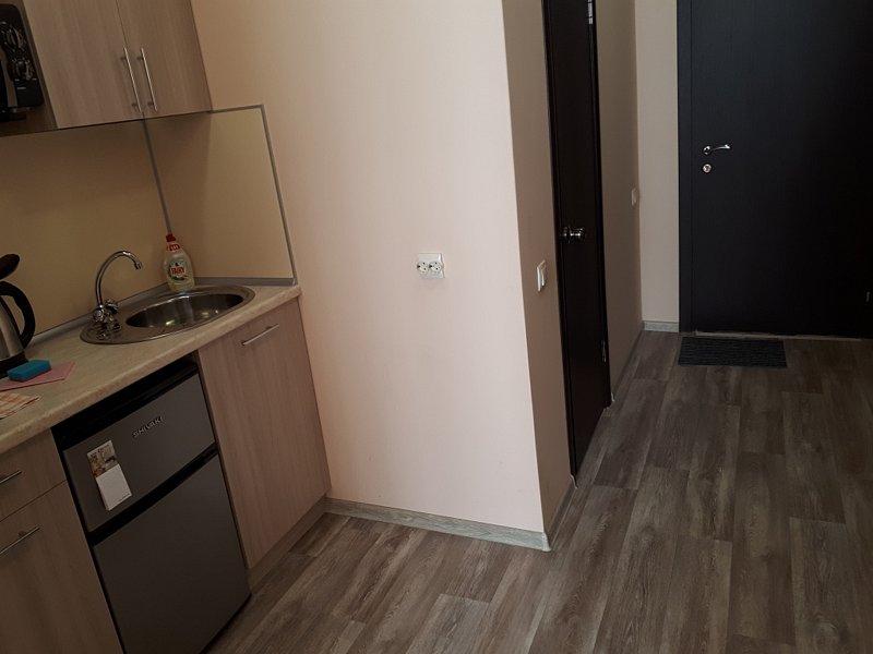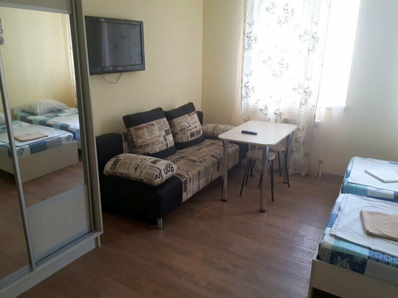 Чистая уютная студия, чистое постельное бельё, полотенца. В номере есть вся бытовая техника, посуда, телевизор, кабельное ТВ, Wi-Fi, стиральная машина автомат, СВЧ печь, чайник, плитка, холодильник и все необходимое для комфортного проживания. Спальные места: раскладной диван, односпальные кровати.