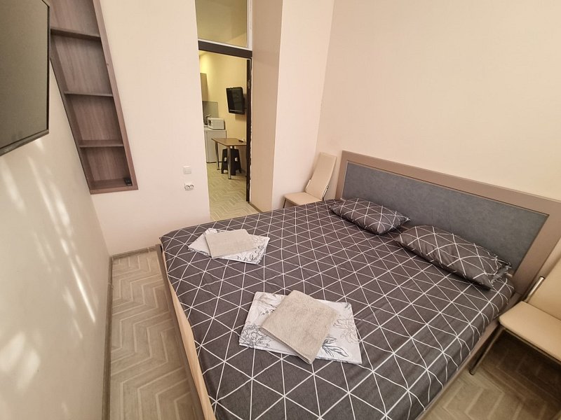 Чистая уютная студия, чистое постельное бельё, полотенца. В номере есть телевизор, кабельное ТВ, Wi-Fi, чайник, холодильник и все необходимое для комфортного проживания. Спальные места: двуспальная кровать.