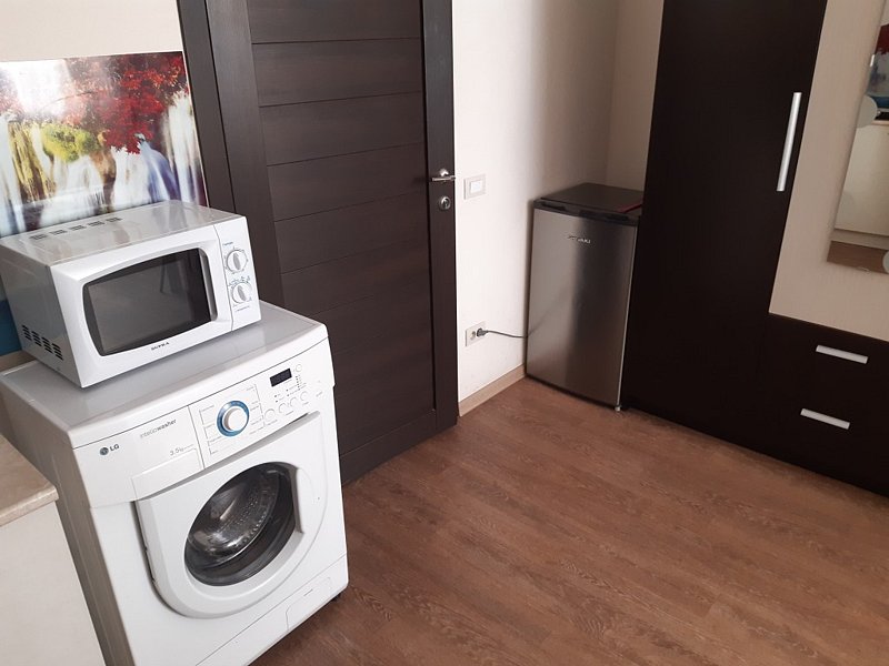 Чистая уютная студия, чистое постельное бельё, полотенца. В номере есть вся бытовая техника, посуда, телевизор, кабельное ТВ, Wi-Fi, стиральная машина автомат, СВЧ печь, чайник, плитка, холодильник и все необходимое для комфортного проживания. Спальные места: раскладной диван, односпальная и двуспальная кровати.