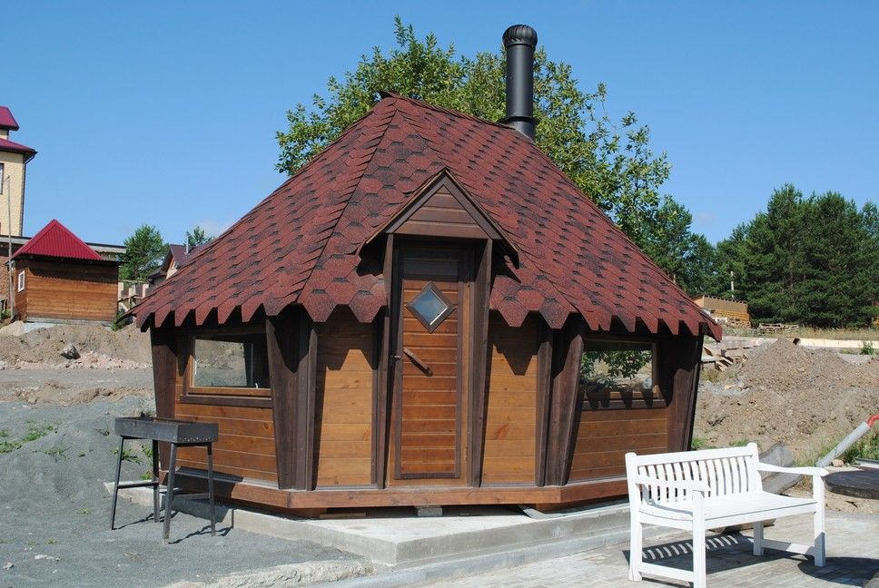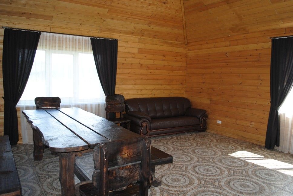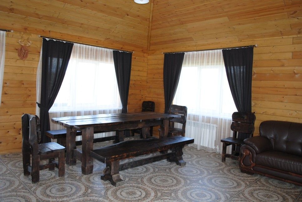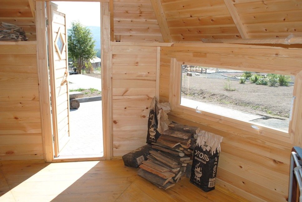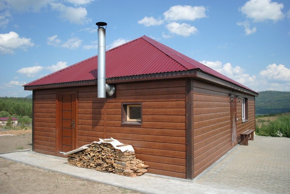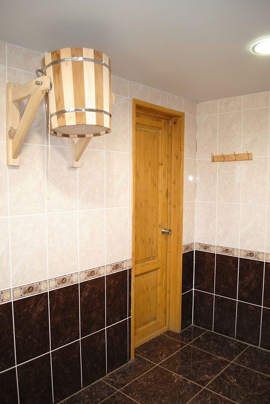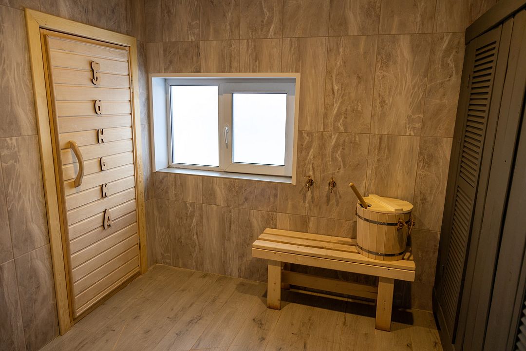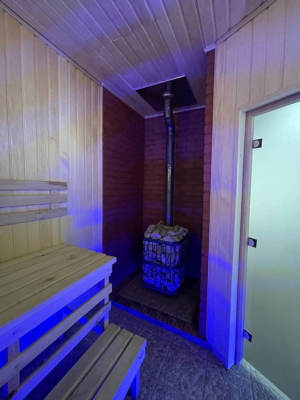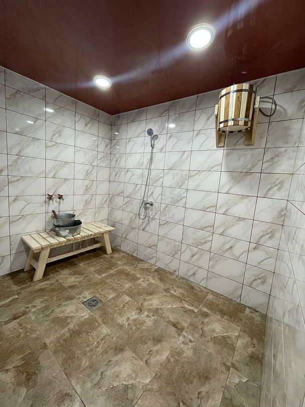 Банька представляет собой одноэтажное сооружение, в большой комнате располагается кухонная зона, большой деревянный стол, уютный и мягкий диван, телевизор. Душевая комната в кафеле, две зоны приема душа, ведро с ледяной водой. Парильная комната с освещением и печкой.