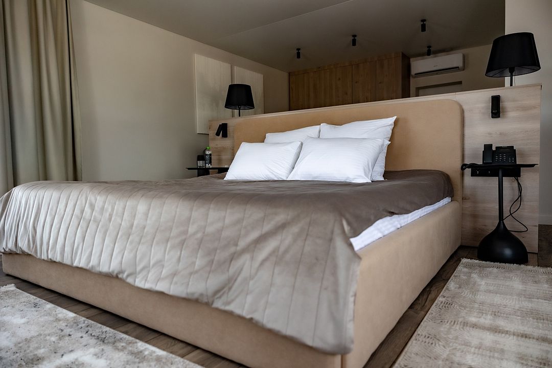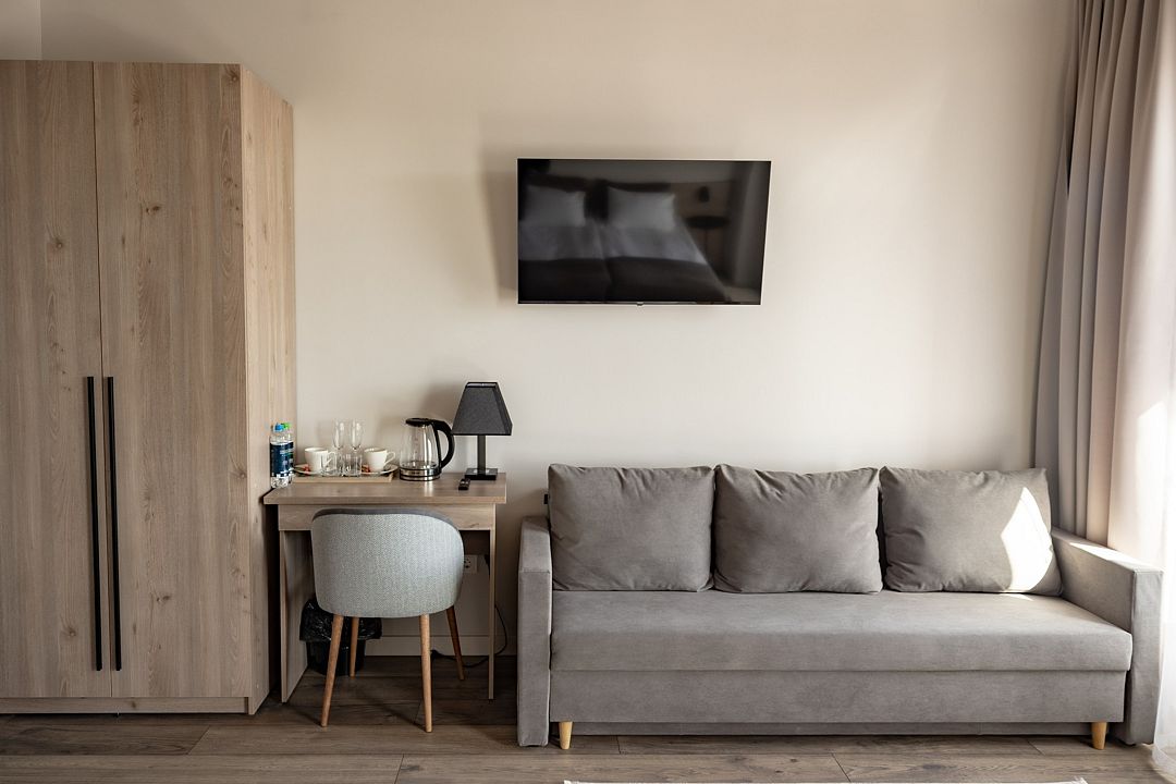 2-спальная кровать, диван, кондиционер, ТВ, кухонная зона, с/у с душем.