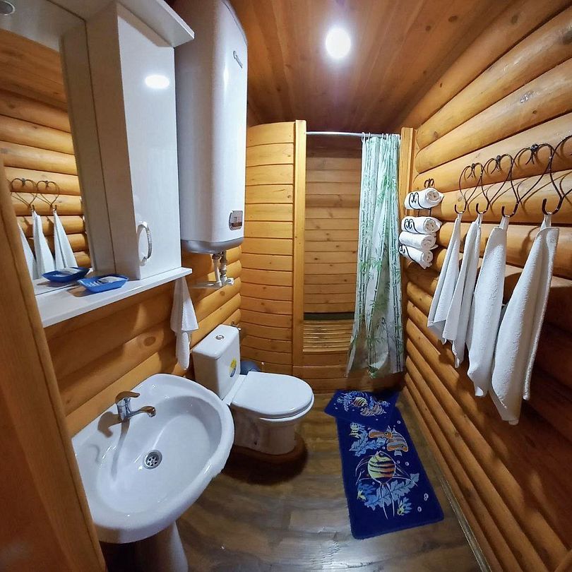 Коттедж оснащён всем необходимым: кондиционер, телевизор, Wi-Fi, система отопления, душ, санузел. Кухня укомплектована плитой, микроволновкой, холодильником, чайником, посудой. В каждом доме система отопления и дровяной камин.