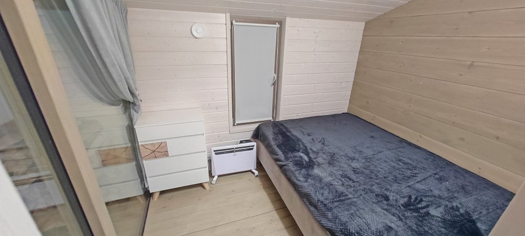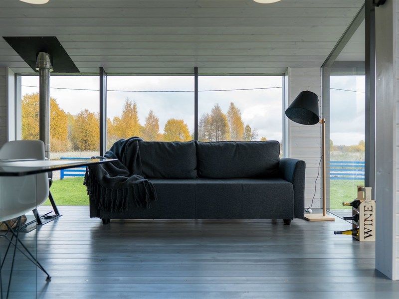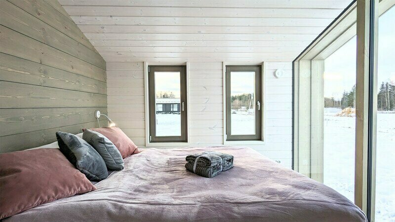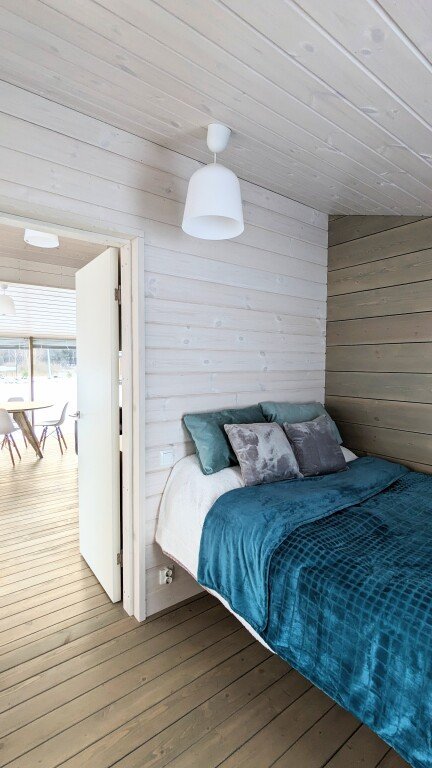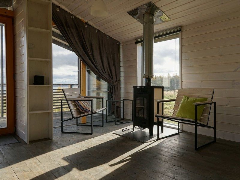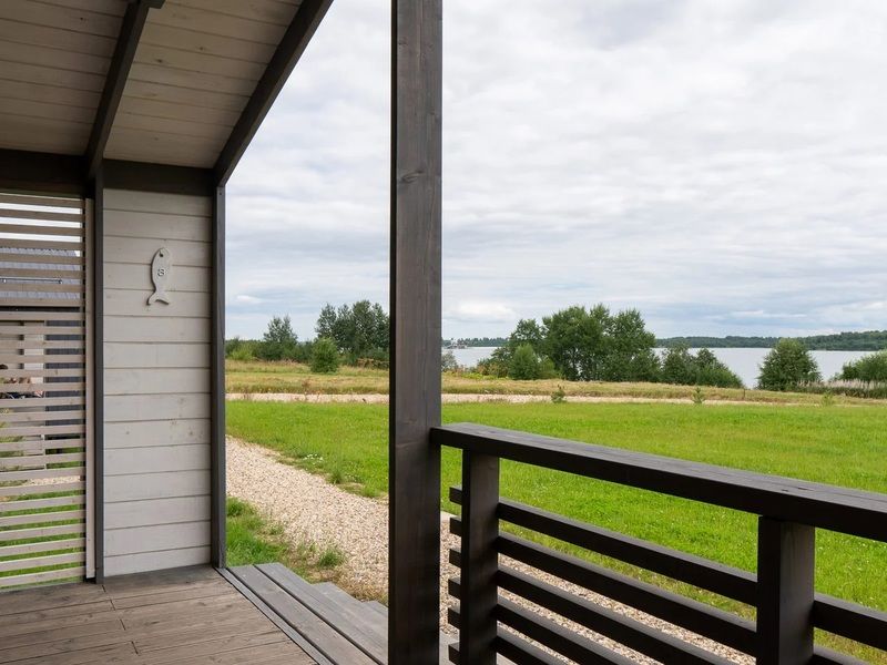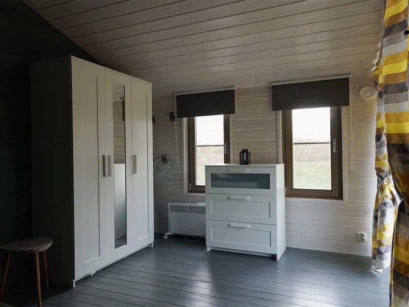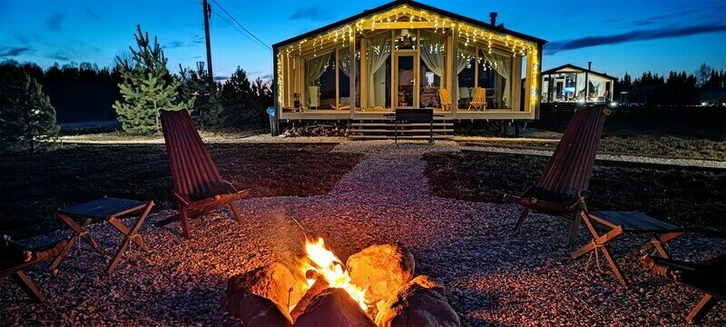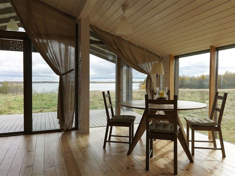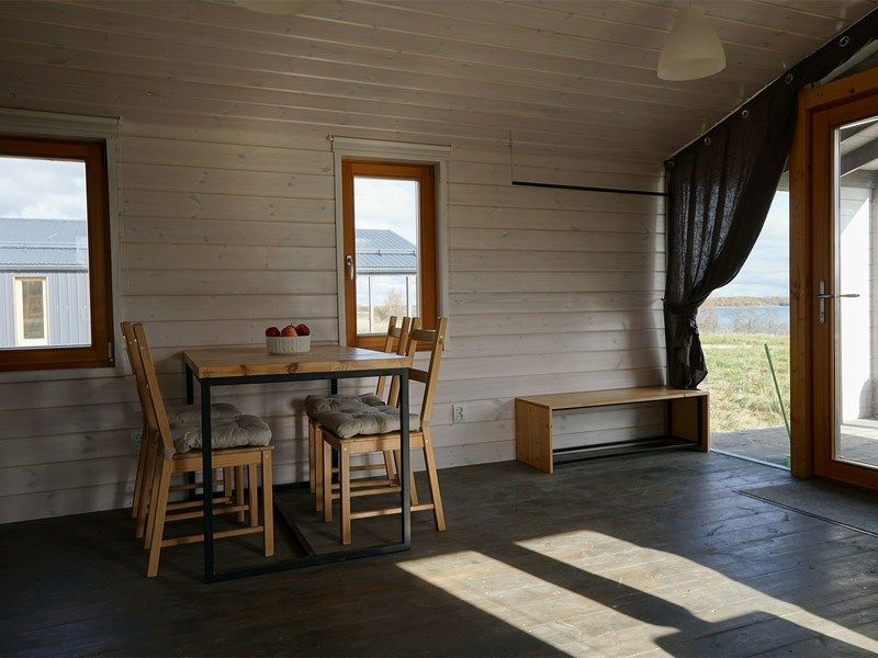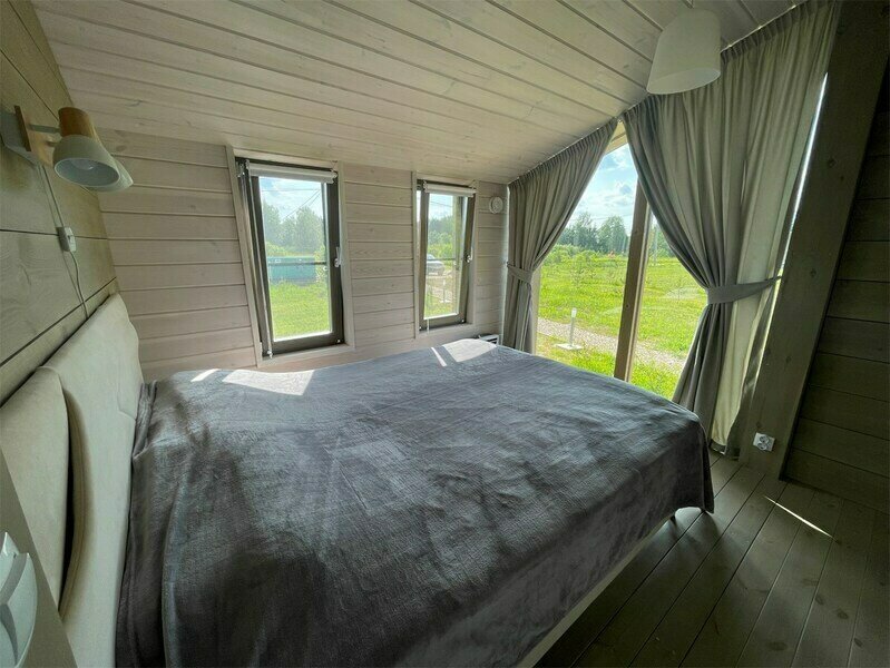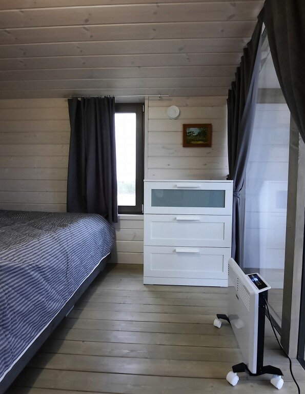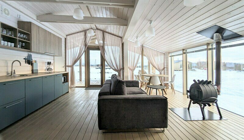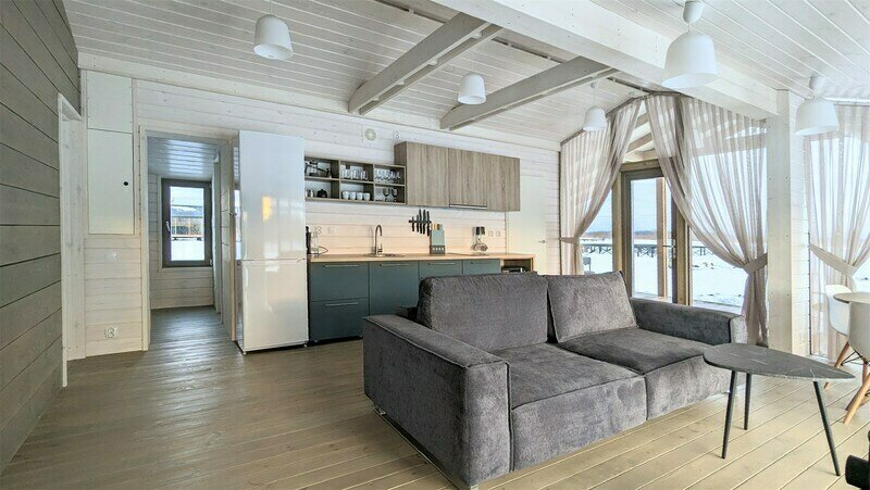 Дом площадью на второй линии от берега в 150 м от воды. Панорамное остекление и веранда, откуда открывается отличный вид на водохранилище. Удобная гостиная с камином, совмещенная с кухней. В доме одна спальня на для двух гостей + 2 места для дополнительного размещения в гостиной. Возможно еще одно дополнительное место.