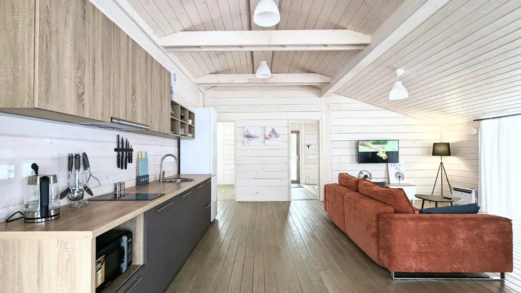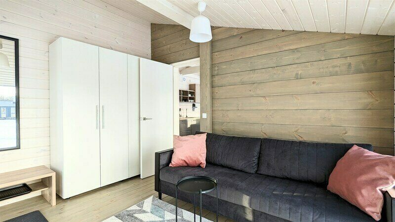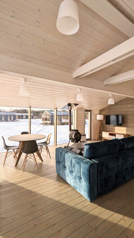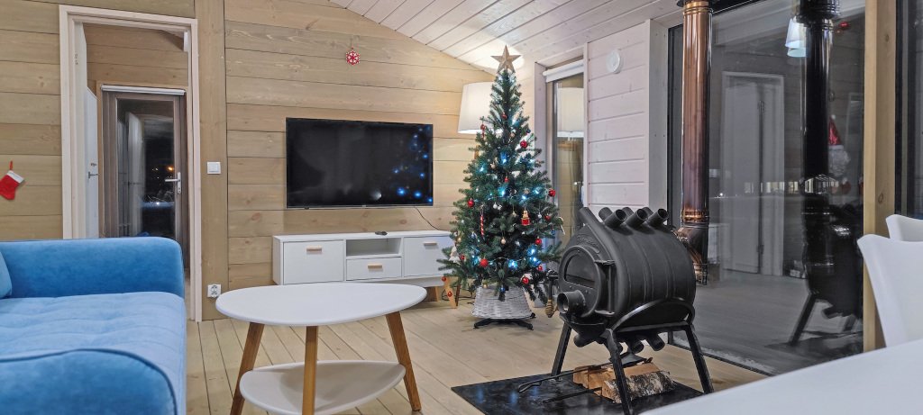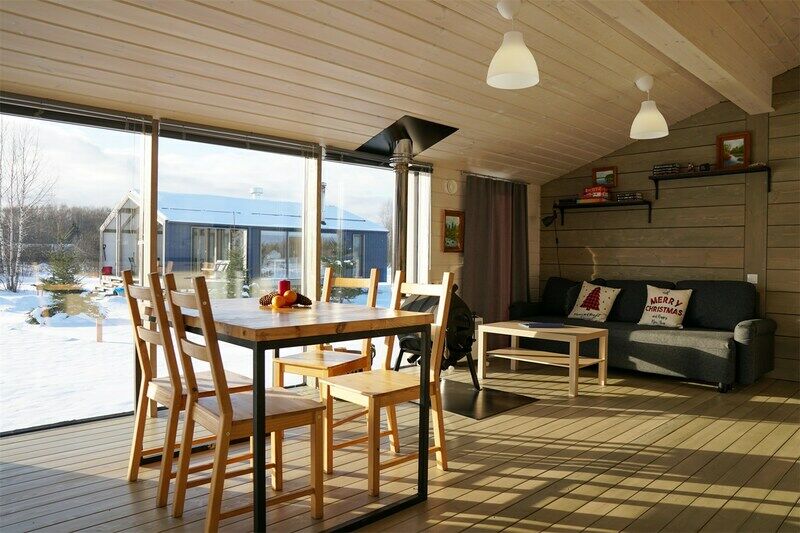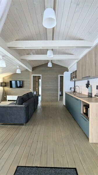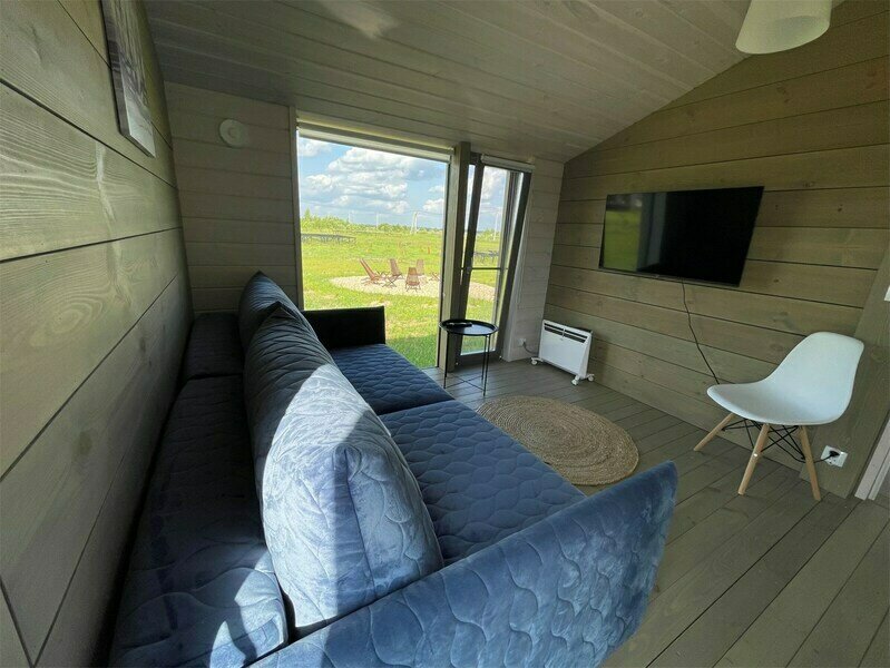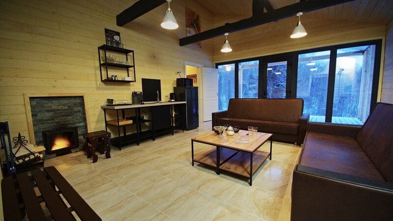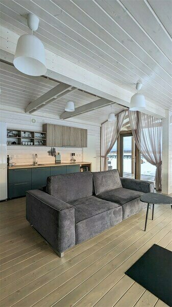 Удобная гостиная с камином, совмещенная с кухней. В доме одна спальня на для двух гостей + 2 места для дополнительного размещения в гостиной. Возможно еще одно дополнительное место.