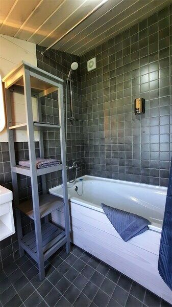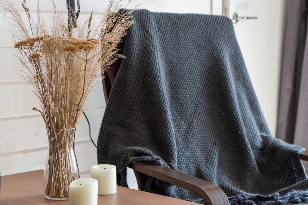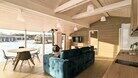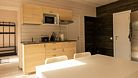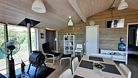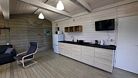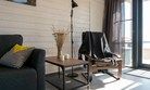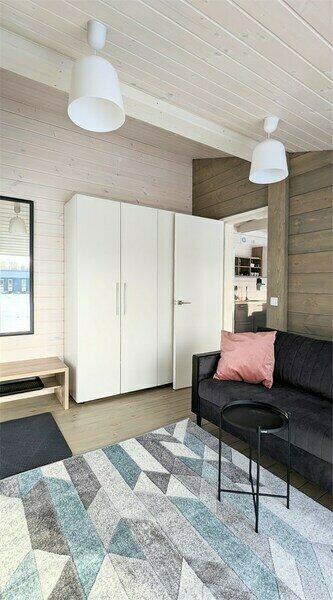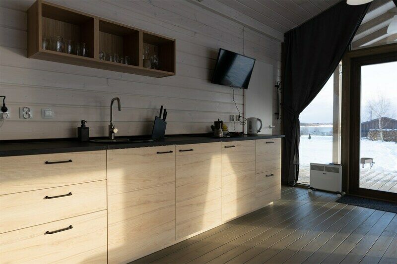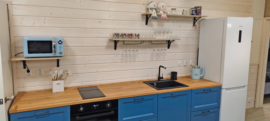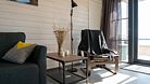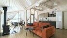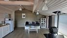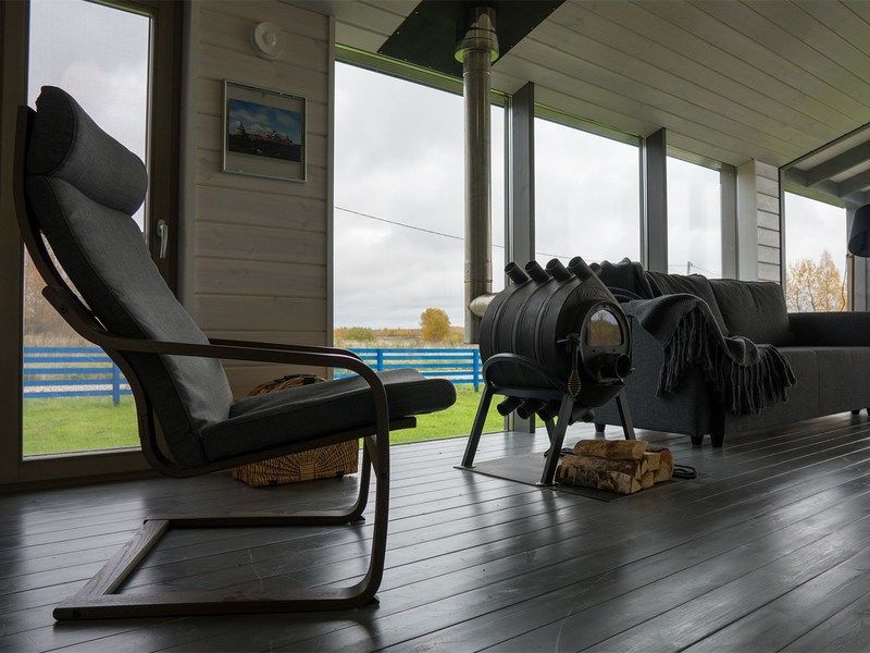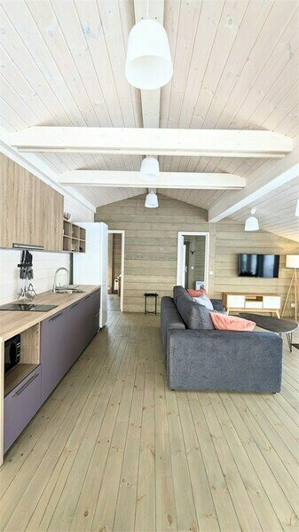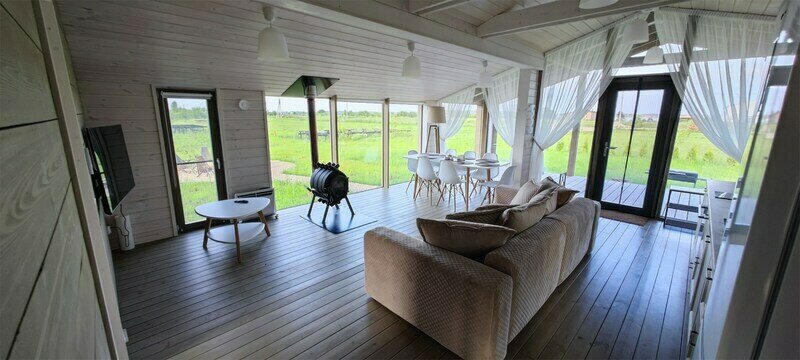 Удобная гостиная с камином, совмещенная с кухней. В доме одна спальня на для двух гостей + 2 места для дополнительного размещения в гостиной. Возможно еще одно дополнительное место.