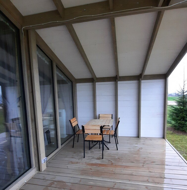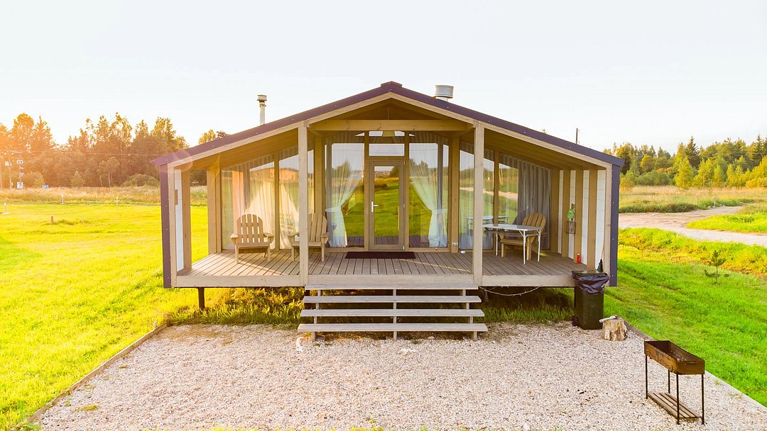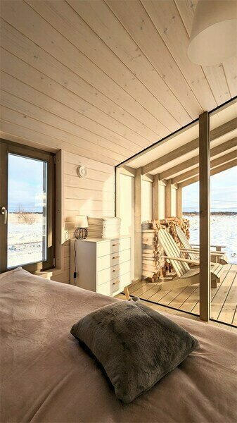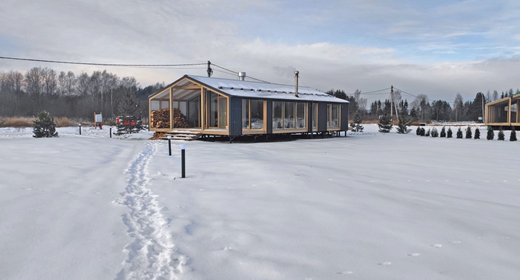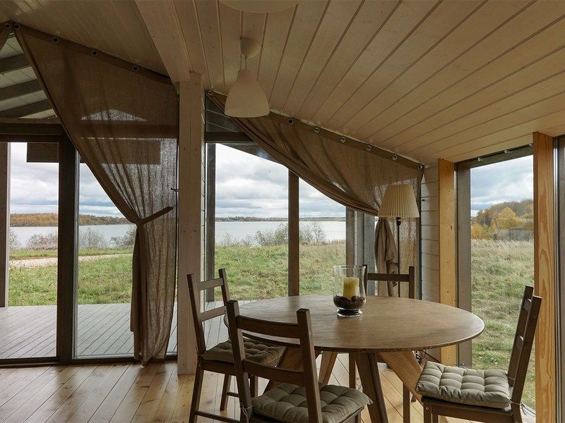 Уютный дом-студия, площадью 26 м². Панорамное остекление и веранда, откуда открывается отличный вид на водохранилище.