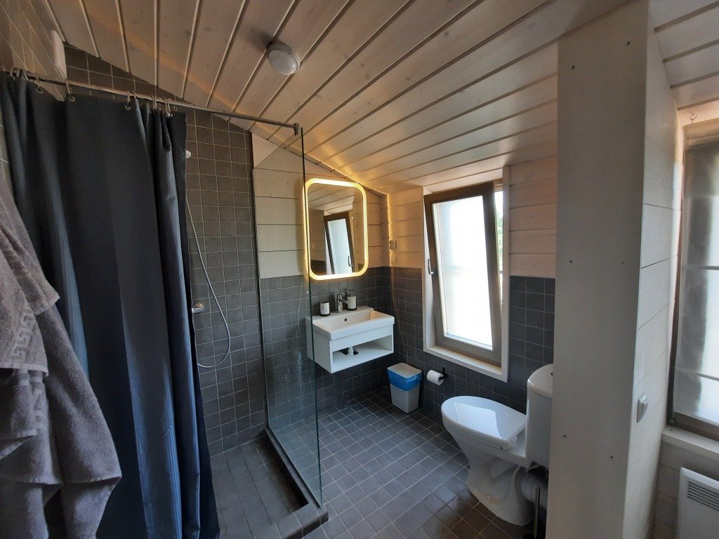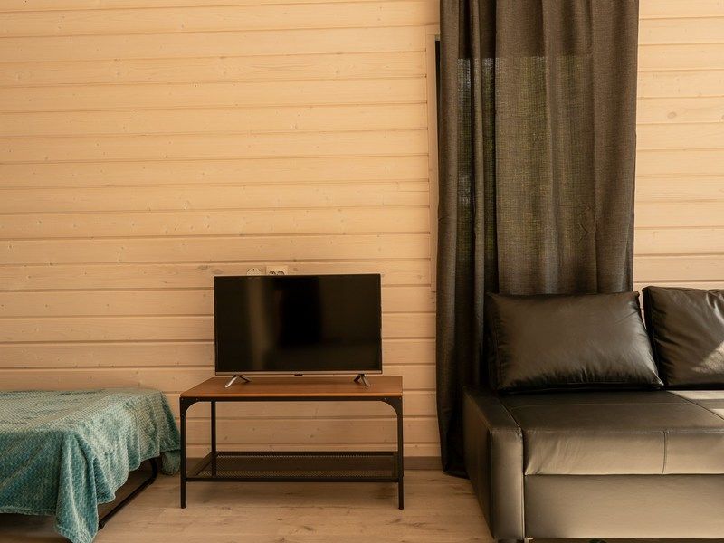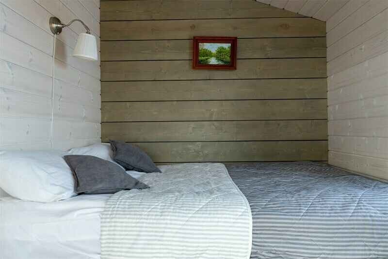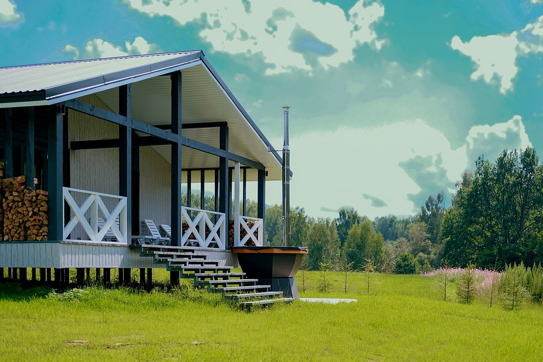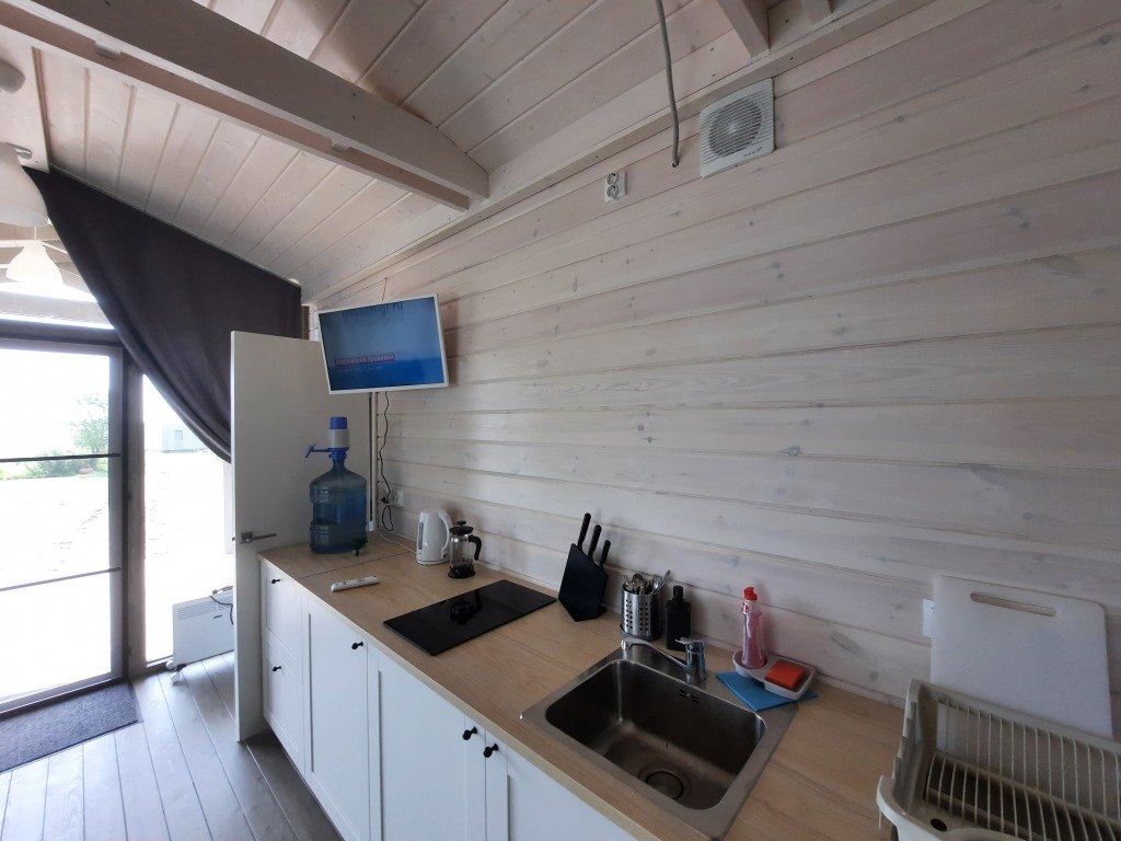Домик 48 кв. м с баней и большой террасой. Оборудован 2-х спальной кроватью, раскладным диваном, кухней в общей гостиной-студии. Белье, полотенца, посуда, кухонные принадлежности в комплекте. Свой мангал с решеткой. Находится в уединенном месте у берега вдали от остальных домиков.