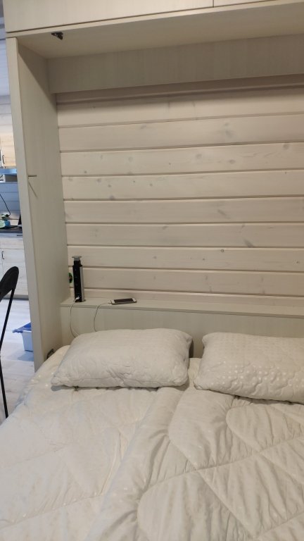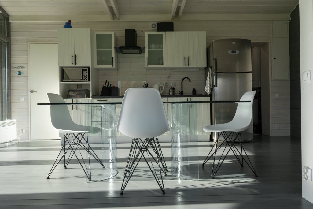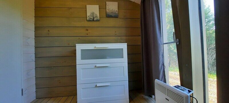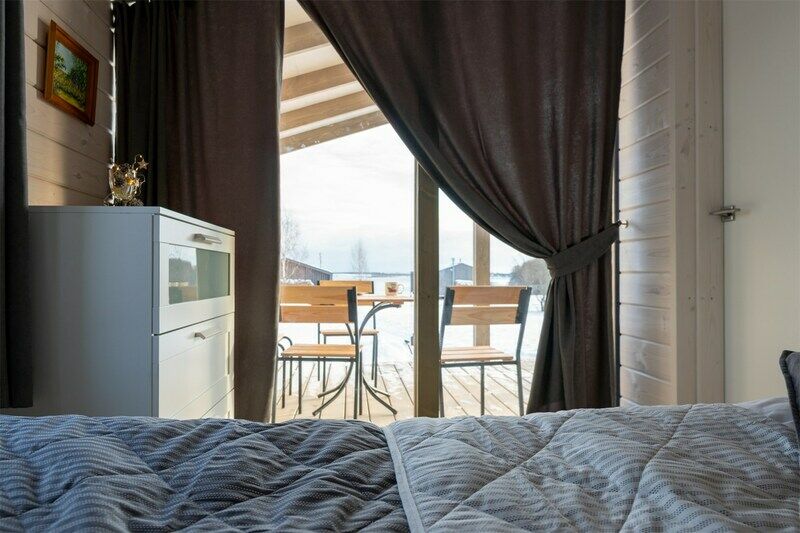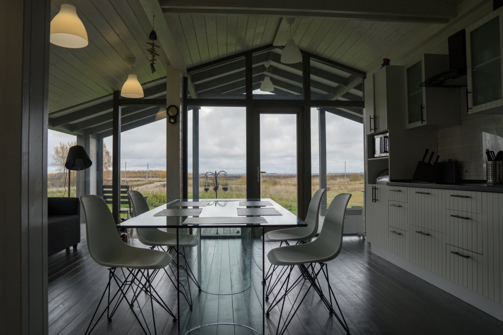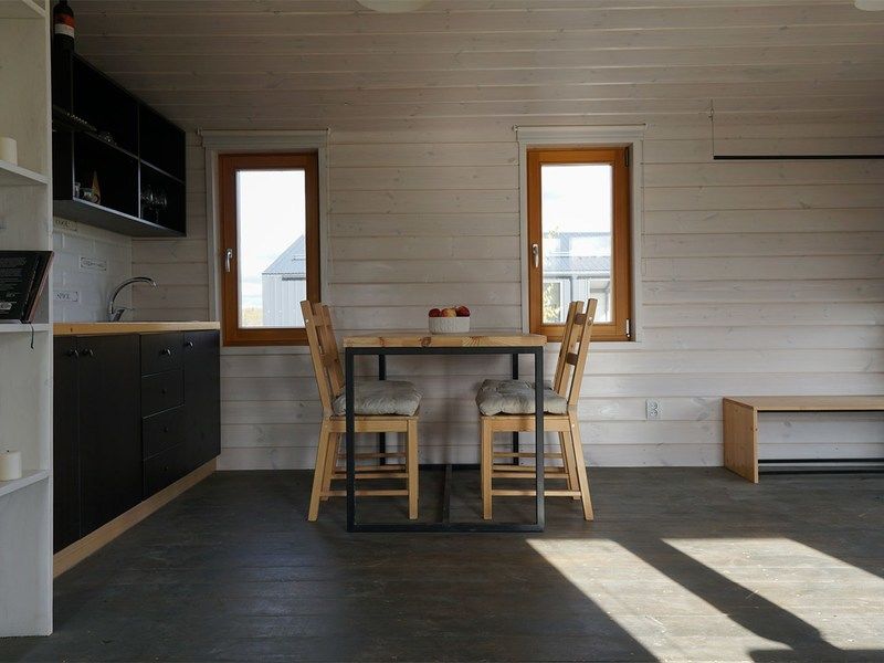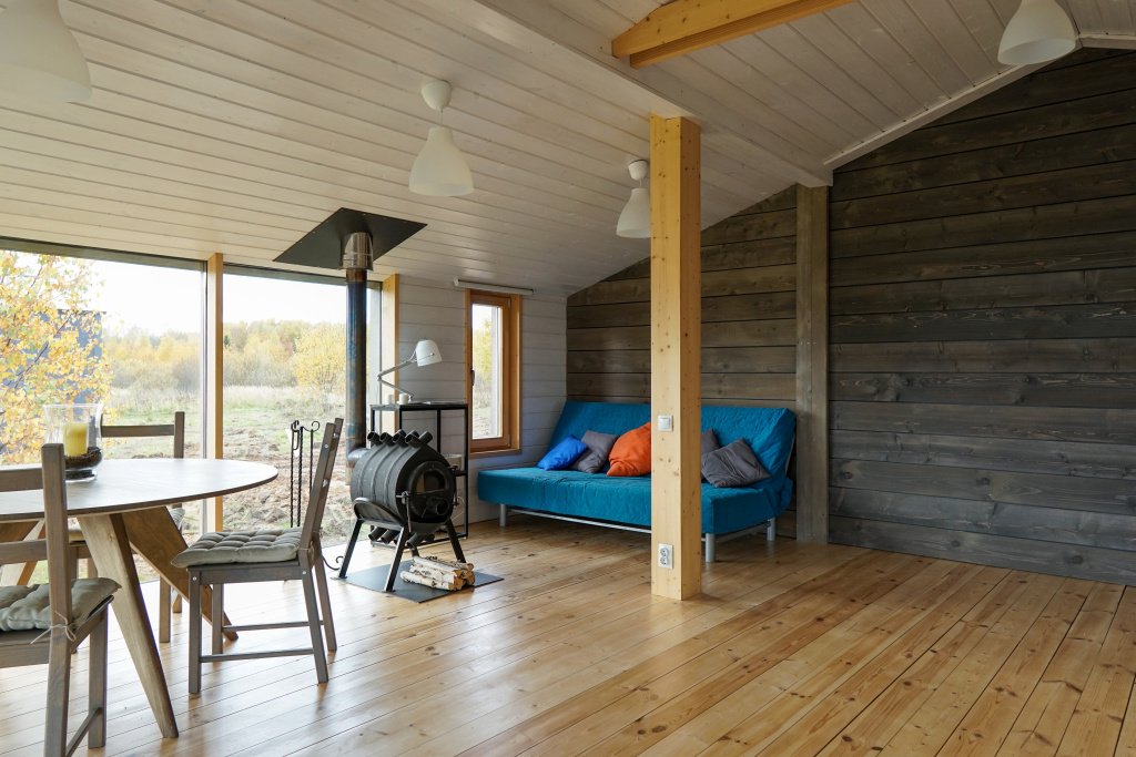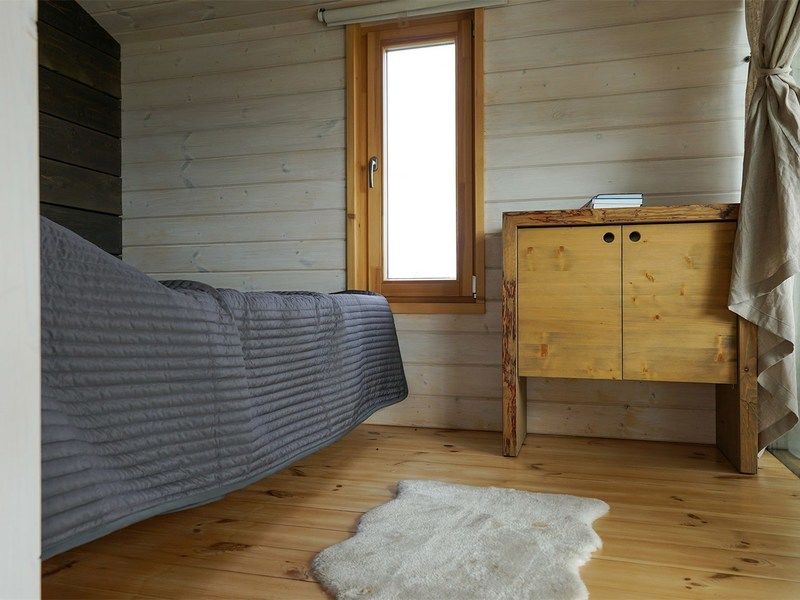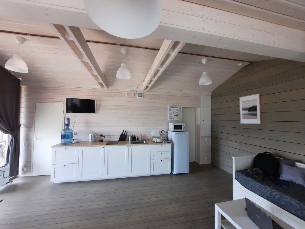 В доме одна комната, совмещенная с кухней и гостинной. Отлично подойдет для уединенного отдыха вдвоем.