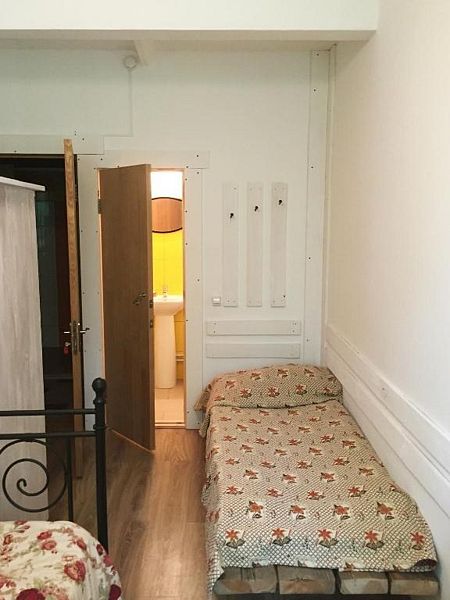 Номер с одной односпальной кроватью и одной двухъярусной кроватью. В номере — шкаф стол, тумбочка, электрочайник. Санузел с раковиной в номере, душ на этаже.