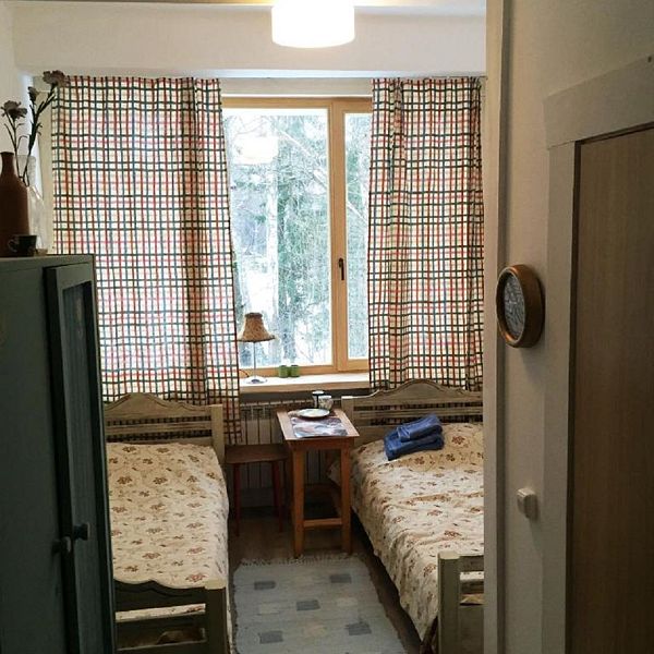 Однокомнатный номер с двумя односпальными кроватями. В номере — шкаф, тумбочка, электрочайник, тапочки. Санузел с раковиной в номере, душ на этаже.