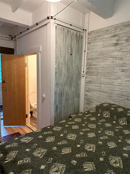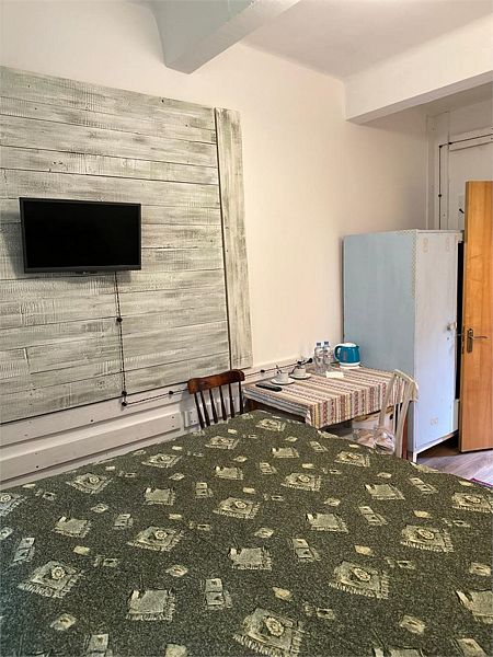 Однокомнатный номер с двуспальной кроватью. В номере — шкаф, тумбочка, электрочайник. Санузел с раковиной в номере, душ на этаже.