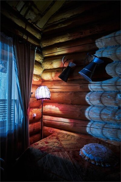 Дом-шале со спальней и гостиной. В доме двуспальная кровать, диван, камин, полати, холодильник, телевизор, электрочайник, фен, тапочки, халаты. Ванная с душем и унитазом. Своя придомовая территория.
