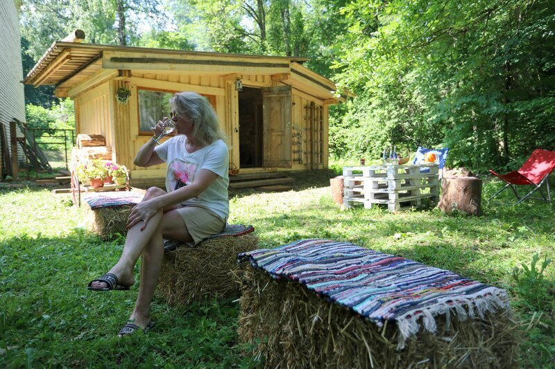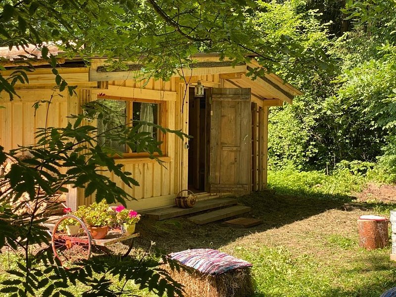 Двухместный коттедж — идеальный вариант для пары. В доме двуспальная кровать, холодильник, телевизор, стол, стул, печка-буржуйка, фен, тапочки. Ванная с душем и туалетом.