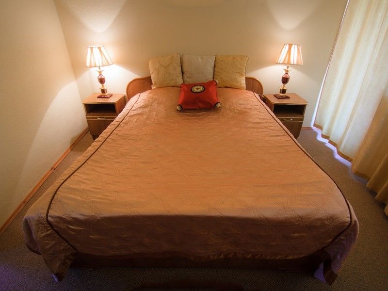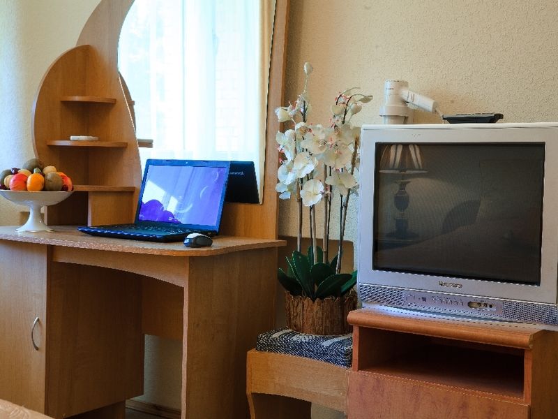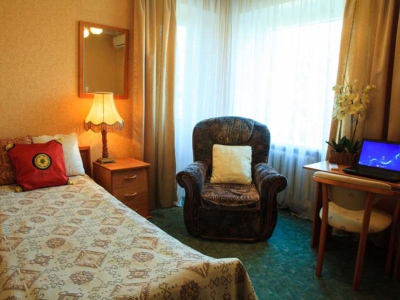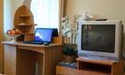 В номере одна 2-х спальная кровать, две прикроватные тумбочки, 2 настольные лампы, зеркало, письменный стол, стул, тумба с телевизором, кресло-кровать, комбинированный шкаф с отделениями для белья и для верхней одежды , холодильник, поднос с кувшином и 2-мя стаканами. При входе в номер – вешалка для одежды. В ванной комнате (санузел совмещённый) - душ, туалетные принадлежности. В номере выход на лоджию с видом на лес. На полу – ковровое покрытие.