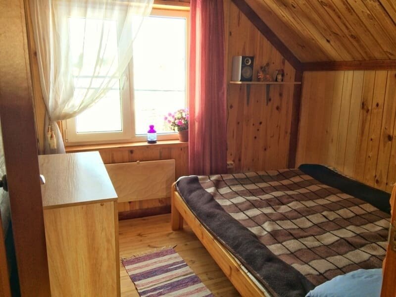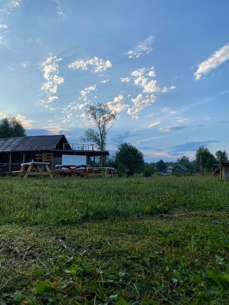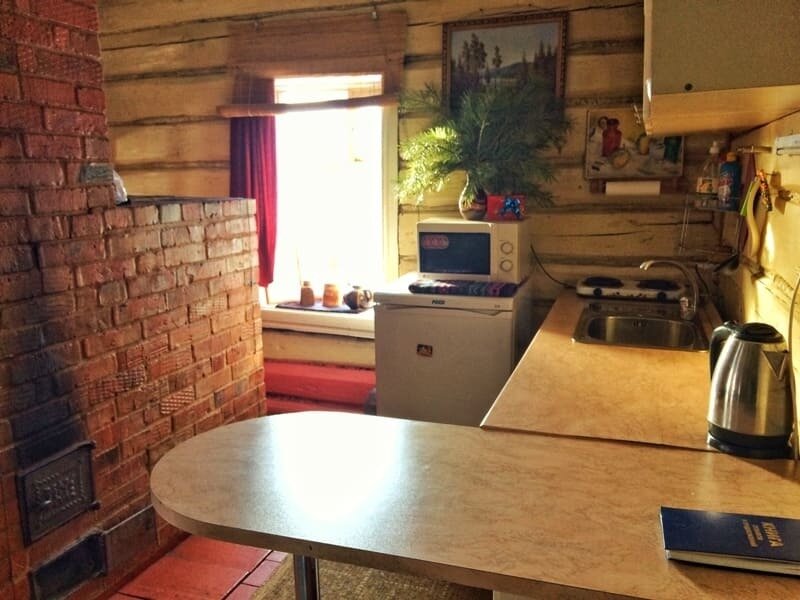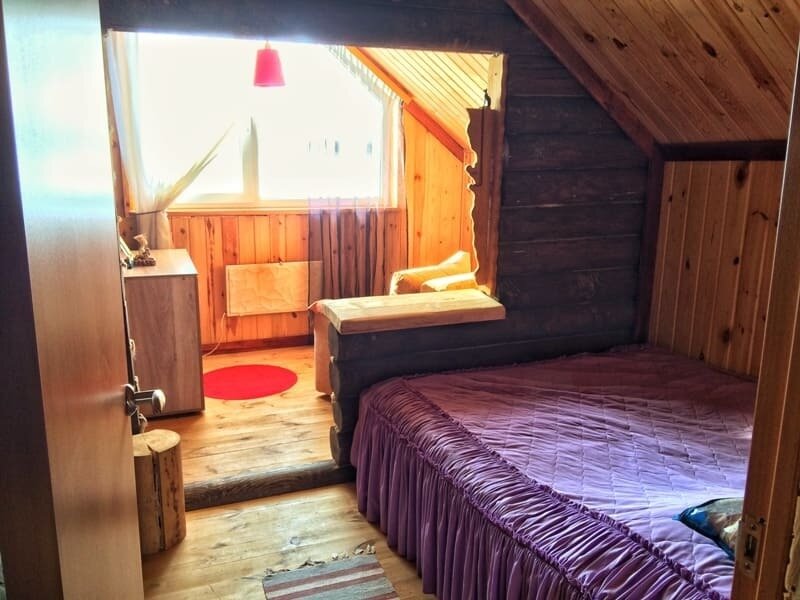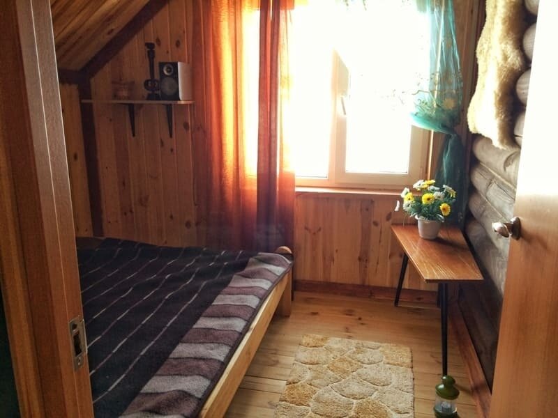 Уютный деревянный двухэтажный дом-изба, рассчитанный на одновременное проживание 12 человек. одна комната, все кровати 2 ярусные. В доме есть все удобства (душ, туалет). А наличие русской печки и большого деревянного стола, позволяет устроить задушевные посиделки в компании. Также в доме имеется телевизор,холодильник, СВЧ, кухонная утварь.