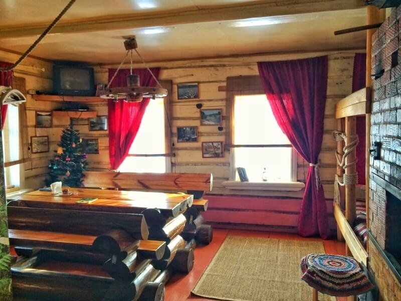 - Гостиная (деревянный стол, печка, тв, dvd, настольные игры);