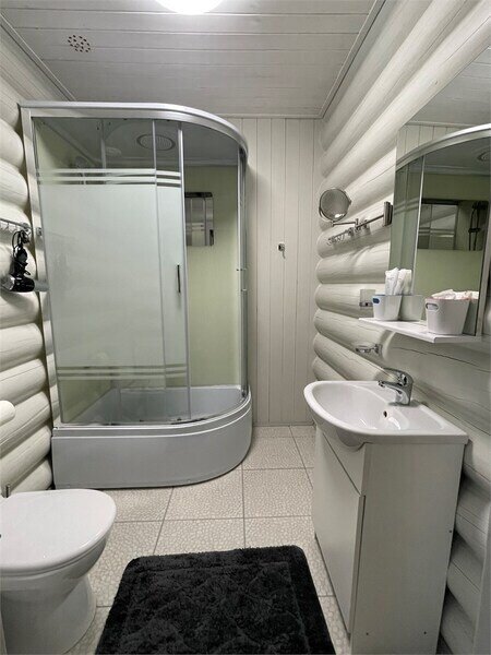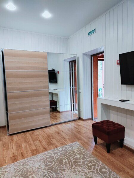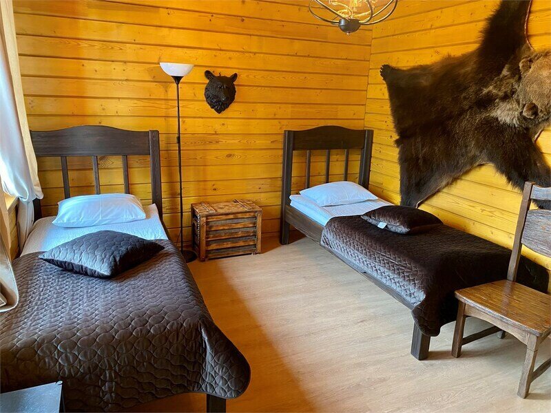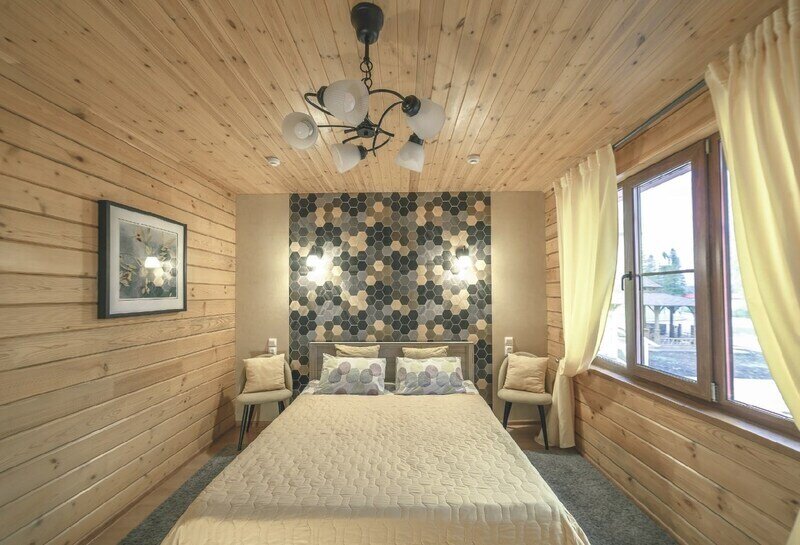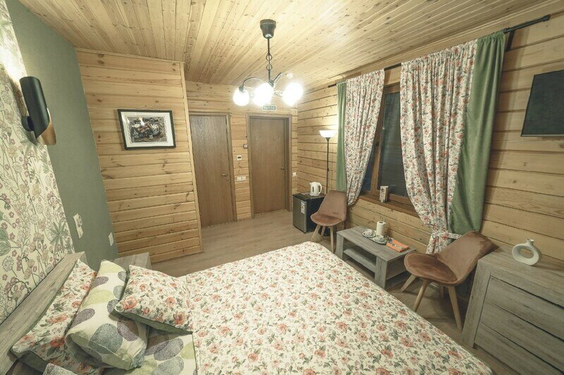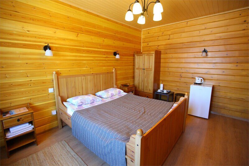 Номера очень уютные полностью обиты деревом, евростеклопакеты, отопление электрическое, на полу ламинат и теплые полы.