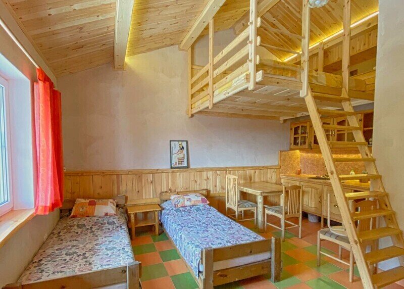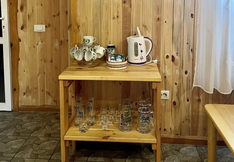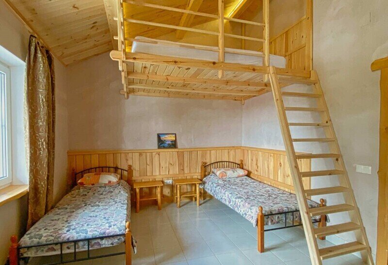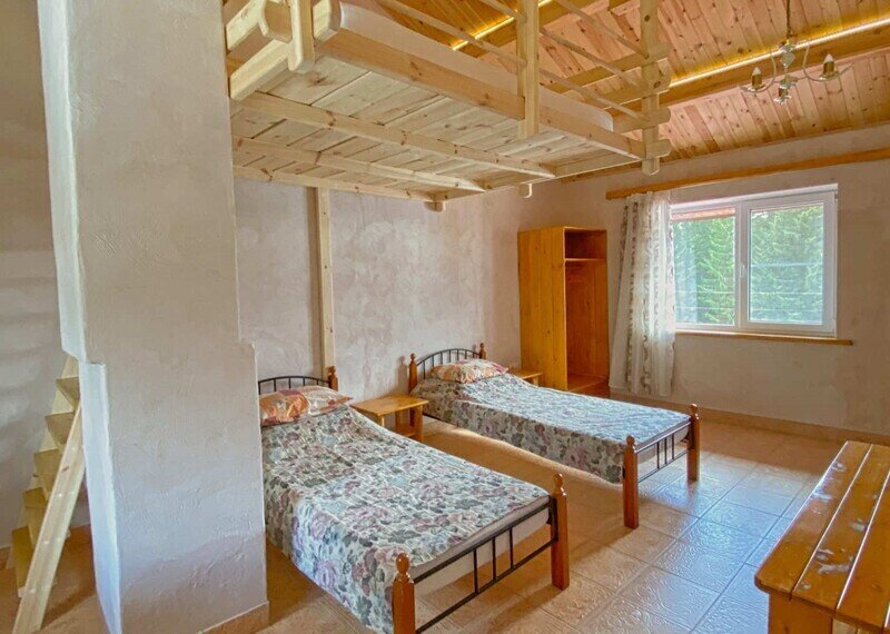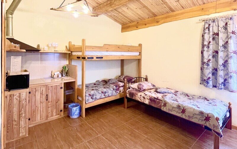 односпальная, двухъярусная кровати, мини кухня (чайник, Х, плита, свч-печь), мангальная зона, с/у душ