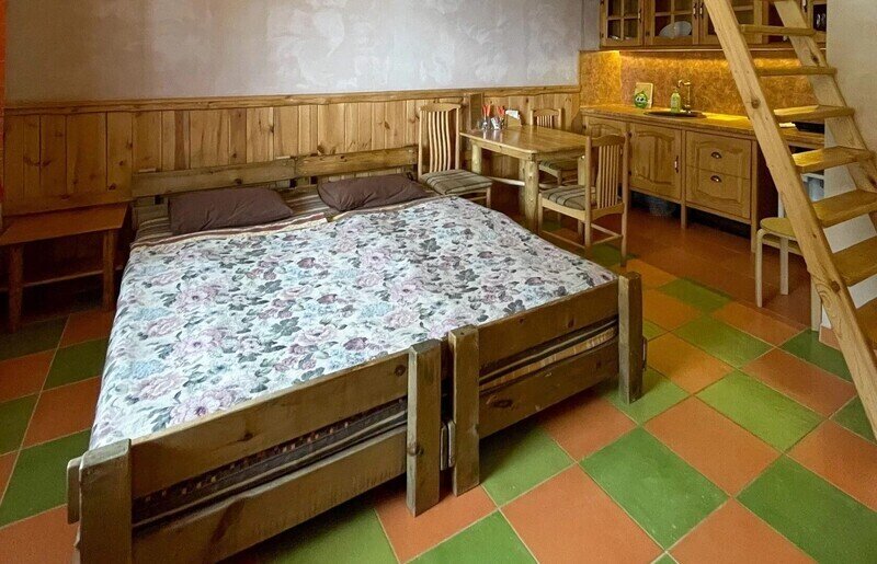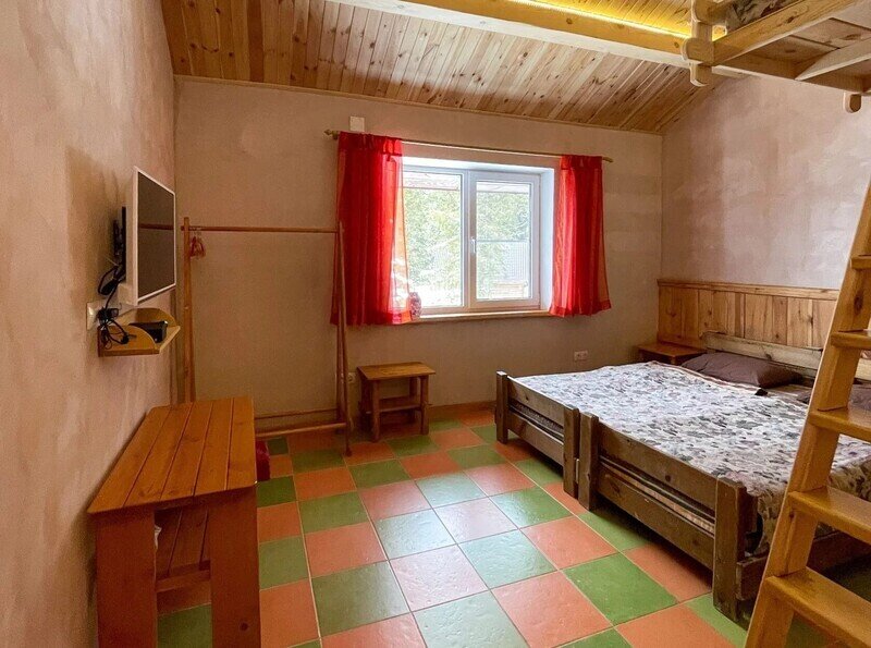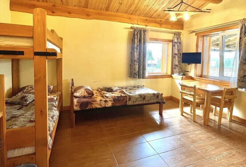 двуспальная, две односпальные кровати, ТВ, Х, плита, чайник, свч-печь, с/у душ
